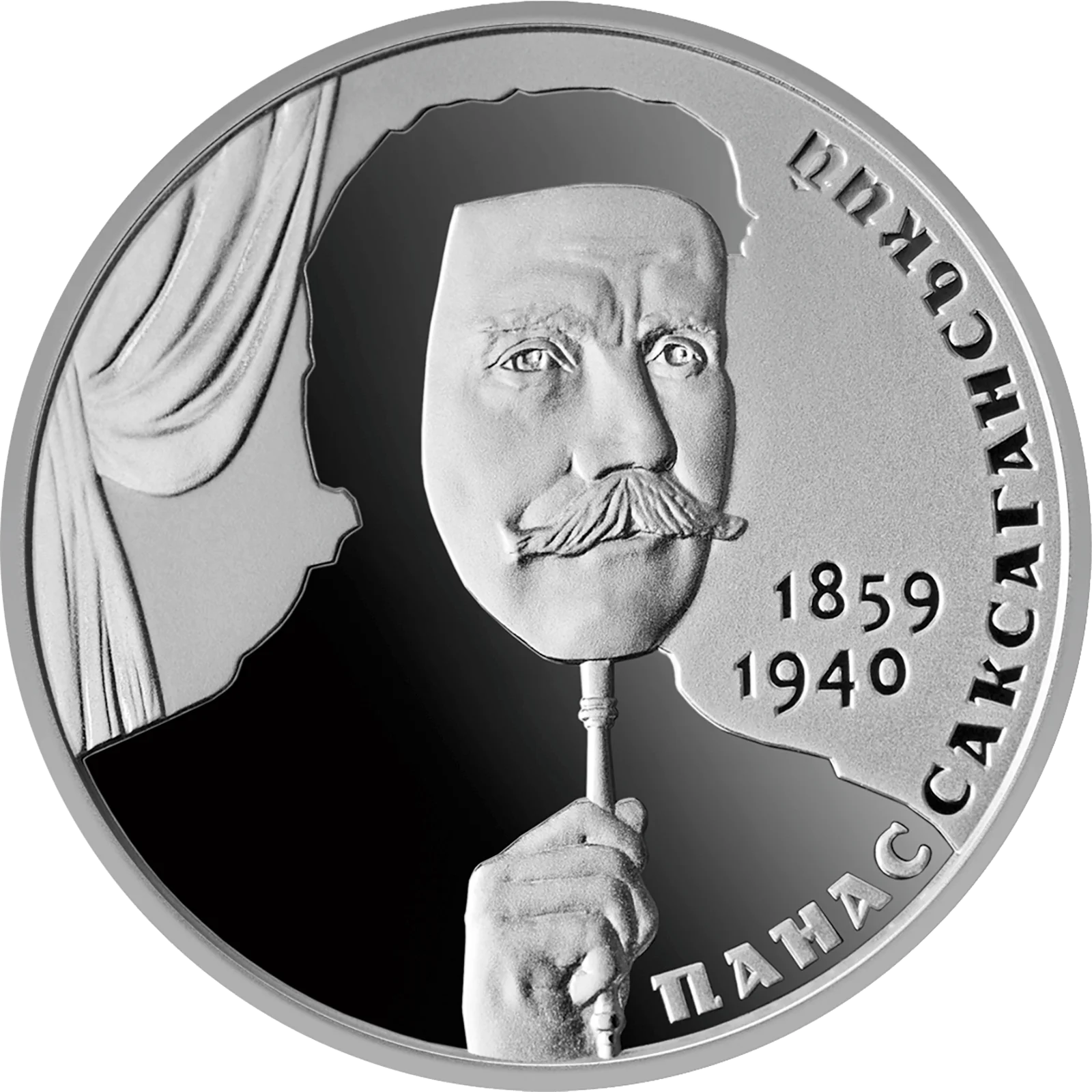 На реверсі монети зображено стилізовану композицію, яка символізує вислів актора: “Кожна людина хоче здаватися не тим, чим вона є. Я знаю добре це, а через те портрета свого я малювати не стану… Переживати і гірке й солодке, бачити і світло й темряву життя і не офарбувати все власним настроєм – не всякому дано…” (Панас Саксаганський “По шляху життя”): дзеркальний абрис актора, який у руці тримає маску з обличчям, що символізує його талант перевтілення; ліворуч – театральна завіса; праворуч – роки його життя 1859/1940 та напис ПАНАС САКСАГАНСЬКИЙ (півколом).