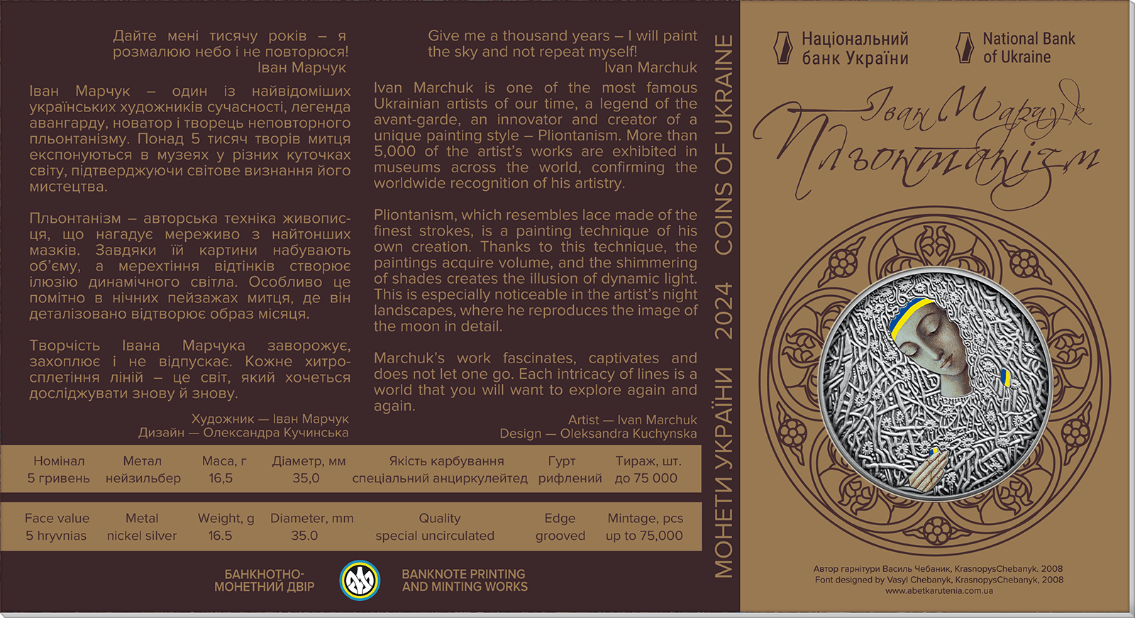 Пам’ятна монета “Пльонтанізм” (Іван Марчук) присвячена унікальній техніці пльонтанізму геніального художника сучасності Івана Марчука. Його авторський стиль, подібний до мережива з найтонших мазків, надає картинам об’ємності, створюючи ілюзію динамічного світла грою відтінків. Ця пам’ятна монета слугує шаною видатному майстру, чий хист і новаторський підхід до живопису здобули визнання в усьому світі. Вона є втіленням невичерпної творчої сили та глибини української душі, які живуть у кожному хитросплетінні ліній на полотнах митця.