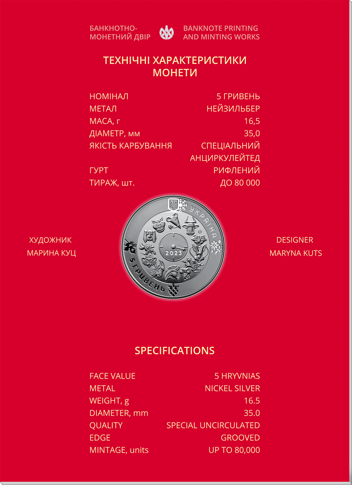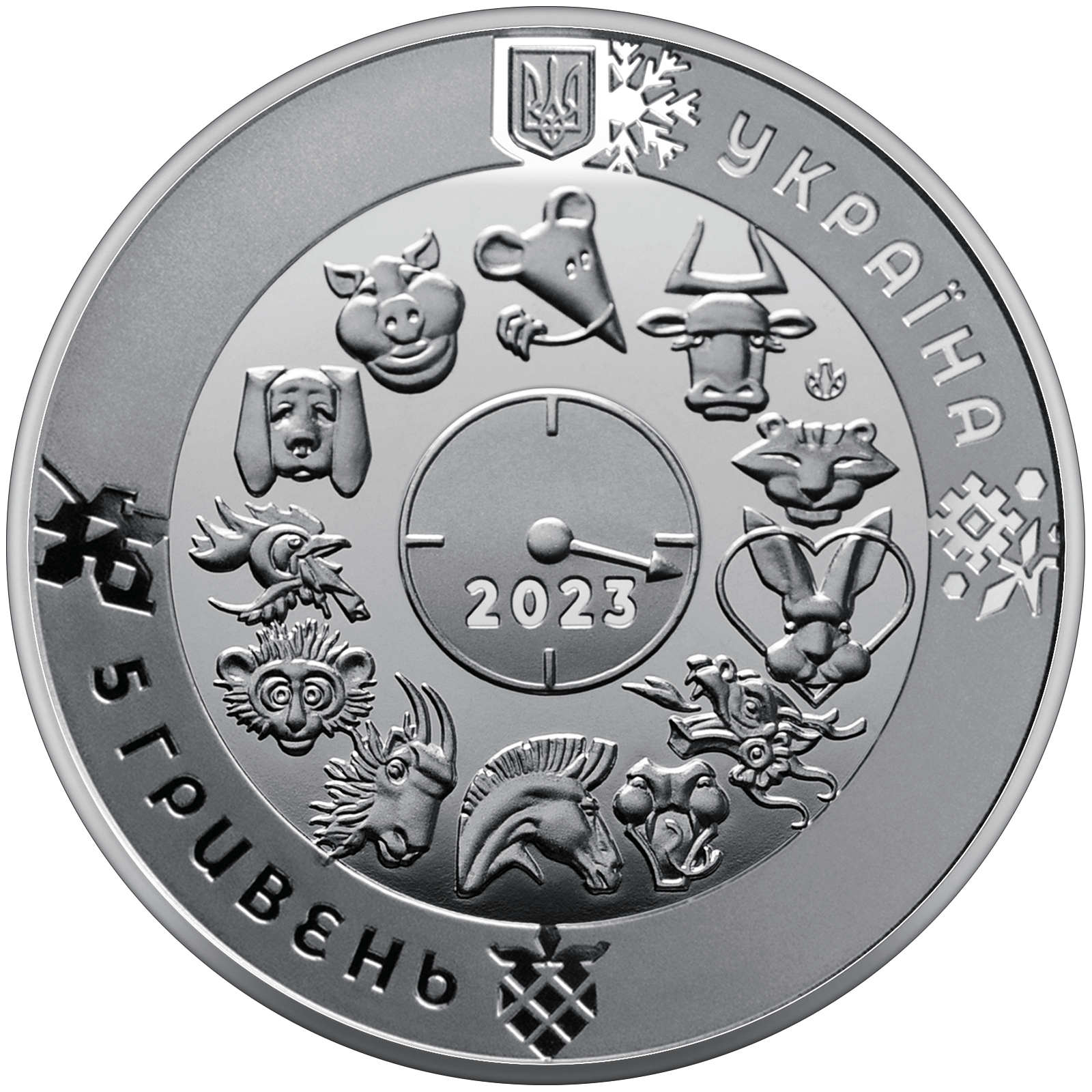 На аверсі монети розміщено: угорі – малий Державний Герб України, праворуч від якого напис півколом УКРАЇНА; на дзеркальному тлі по колу зображені 12 символів східного календаря, у центрі кола – стилізований годинник зі стрілкою, що вказує на кролика – символ року, під стрілкою – 2023; унизу ліворуч напис півколом 5 ГРИВЕНЬ; на матовому тлі зображені стилізовані під українську витинанку символи кожної пори року: сніжинка (угорі), квітка (праворуч), ягода (унизу), листок (ліворуч); логотип Банкнотно-монетного двору Національного банку України (ліворуч від символу кролика).