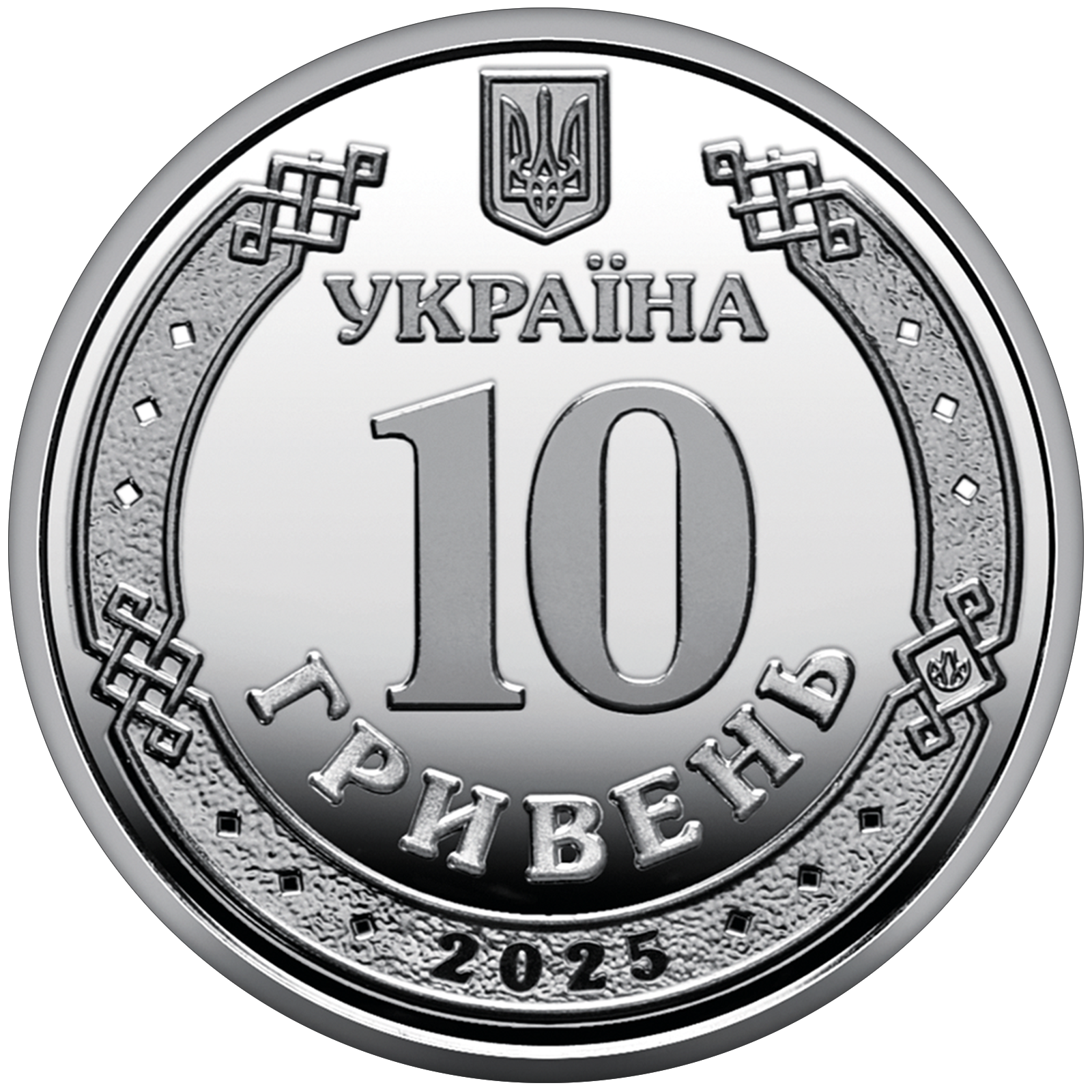 На аверсі монети зображено малий Державний Герб України (угорі); у центрі в обрамленні давньоруського орнаменту розміщено написи: УКРАЇНА / 10 / ГРИВЕНЬ (півколом); на тлі орнаменту зазначено рік карбування монети – 2025 (унизу) та логотип Банкнотно-монетного двору Національного банку України (праворуч).