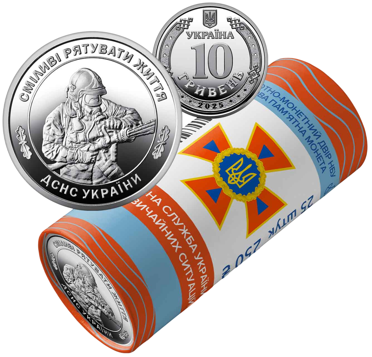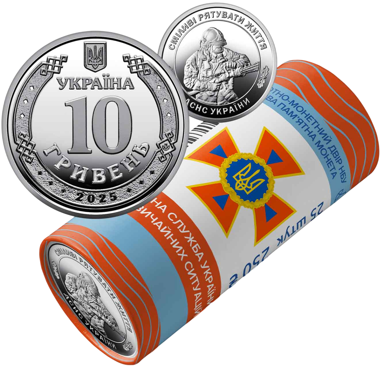 Ролик обігових пам’ятних монет присвячено центральному органу виконавчої влади, що реалізує державну політику у сфері цивільного захисту, захисту населення і територій від надзвичайних ситуацій та запобігання їх виникненню, ліквідації наслідків надзвичайних ситуацій, рятувальної справи, гасіння пожеж, пожежної та техногенної безпеки, діяльності аварійно-рятувальних служб, а також гідрометеорологічної діяльності. Монета вшановує мужність, самовідданість і професіоналізм особового складу Державної служби України з надзвичайних ситуацій (далі – ДСНС), який щодня рятує життя та забезпечує безпеку громадян – як у мирний час, так і в умовах воєнного стану. На сувенірному папері, у який запаковано кожний ролик, розміщено написи: БАНКНОТНО-МОНЕТНИЙ ДВІР НБУ, ОБІГОВА ПАМ’ЯТНА МОНЕТА, ДЕРЖАВНА СЛУЖБА УКРАЇНИ З НАДЗВИЧАЙНИХ СИТУАЦІЙ, 25 ШТУК, номінал 250 та графічний знак гривні; логотип Банкнотно-монетного двору Національного банку України та зображення емблеми ДСНС.