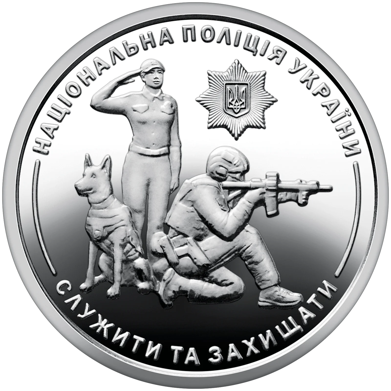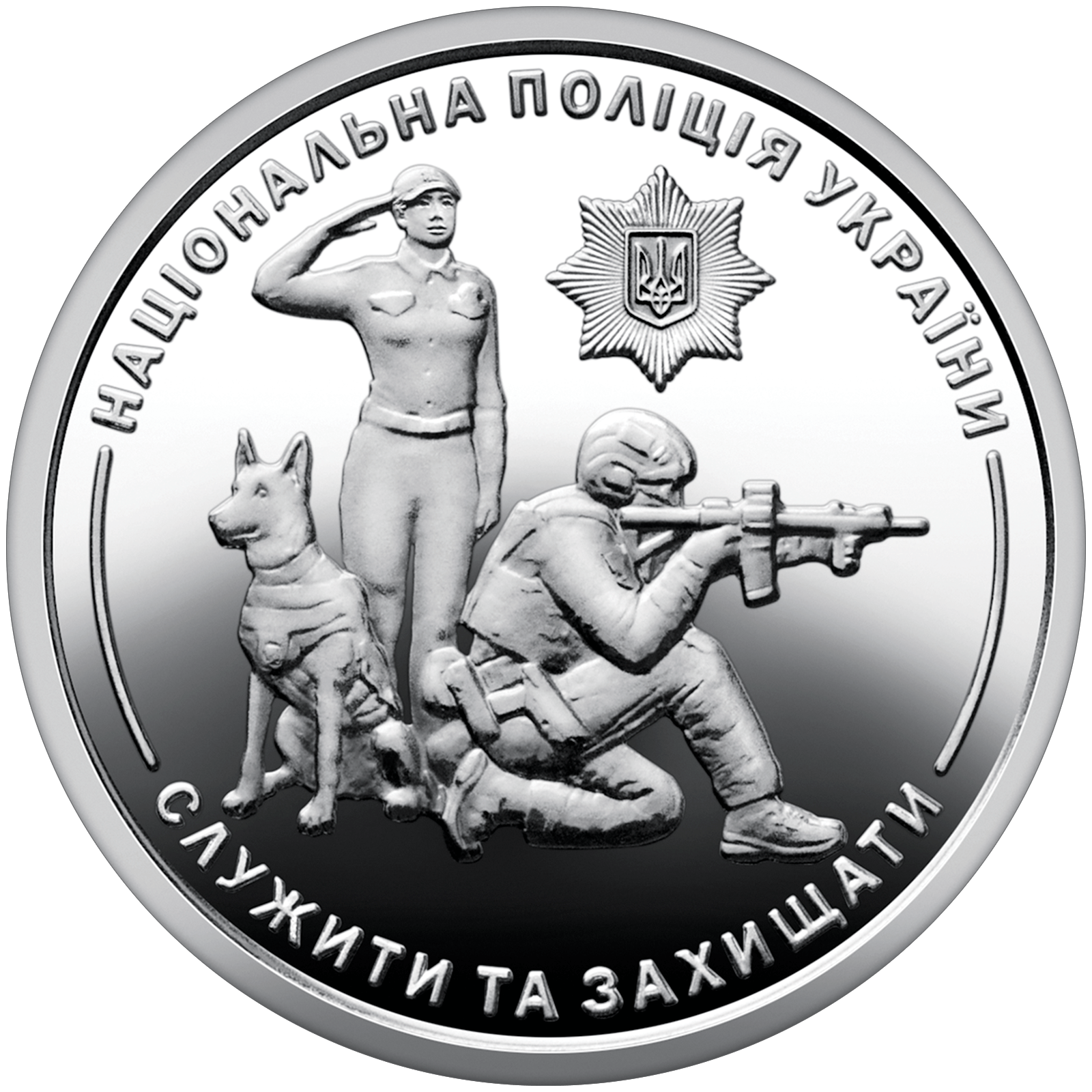 На реверсі монети зображено стилізовану композицію, що включає представників різних підрозділів поліції, які уособлюють професійність, мужність і відданість службі. Над композицією розміщена емблема Національної поліції України – восьмикутна зірка з малим Державним Гербом України в центрі. По колу монети зазначено написи: угорі – НАЦІОНАЛЬНА ПОЛІЦІЯ УКРАЇНИ, унизу – СЛУЖИТИ ТА ЗАХИЩАТИ – гасло, що відображає основну місію цього правоохоронного органу.