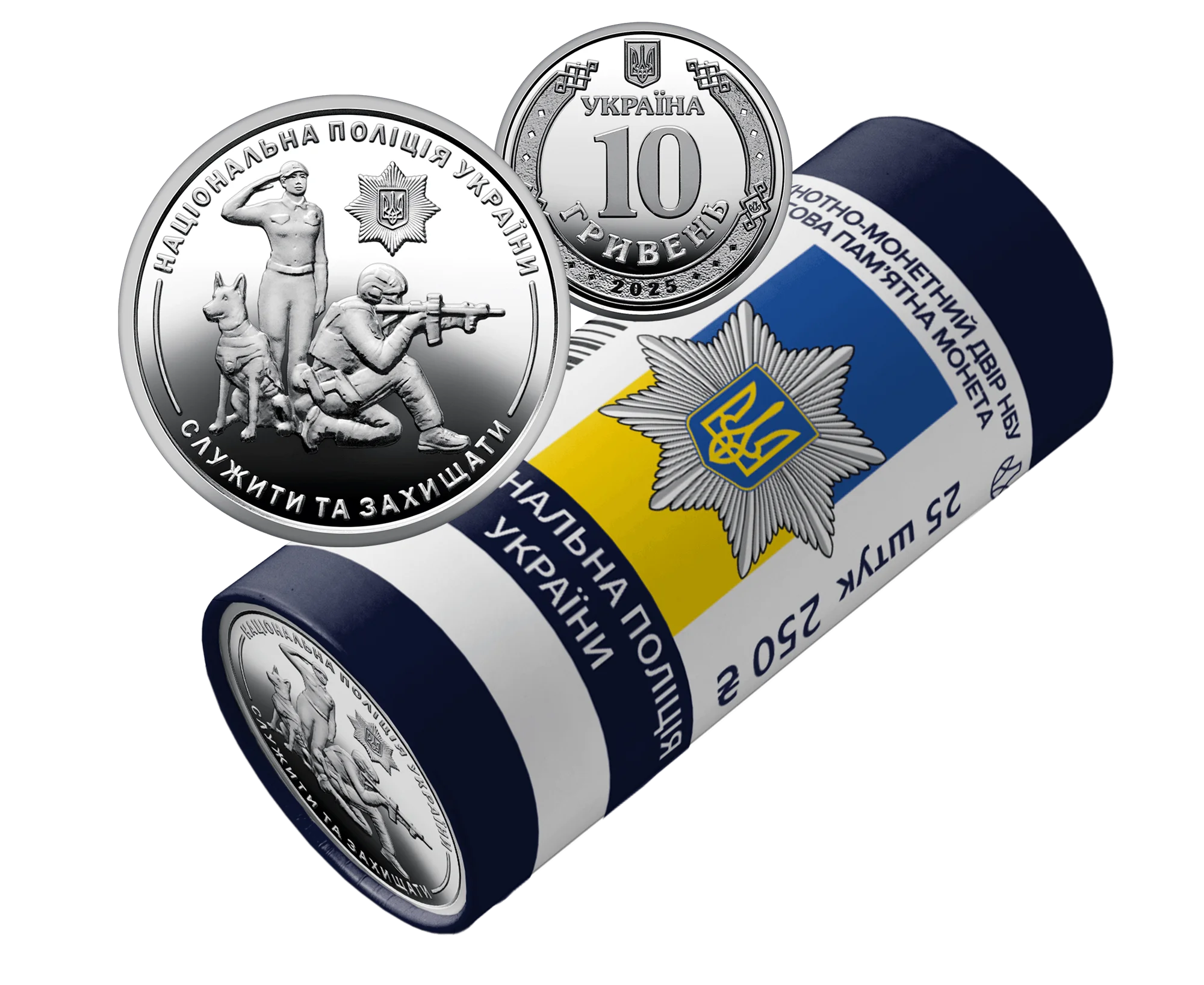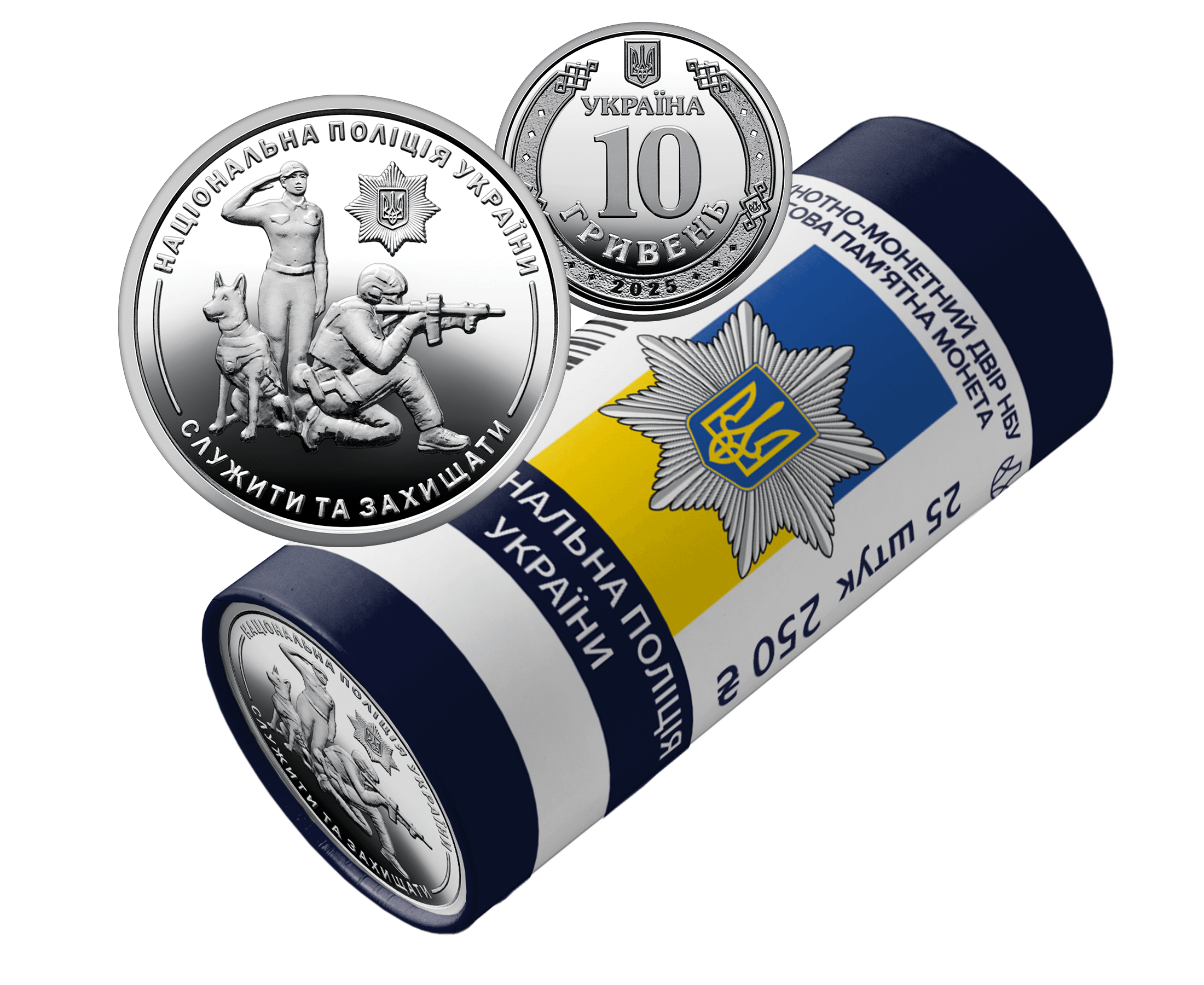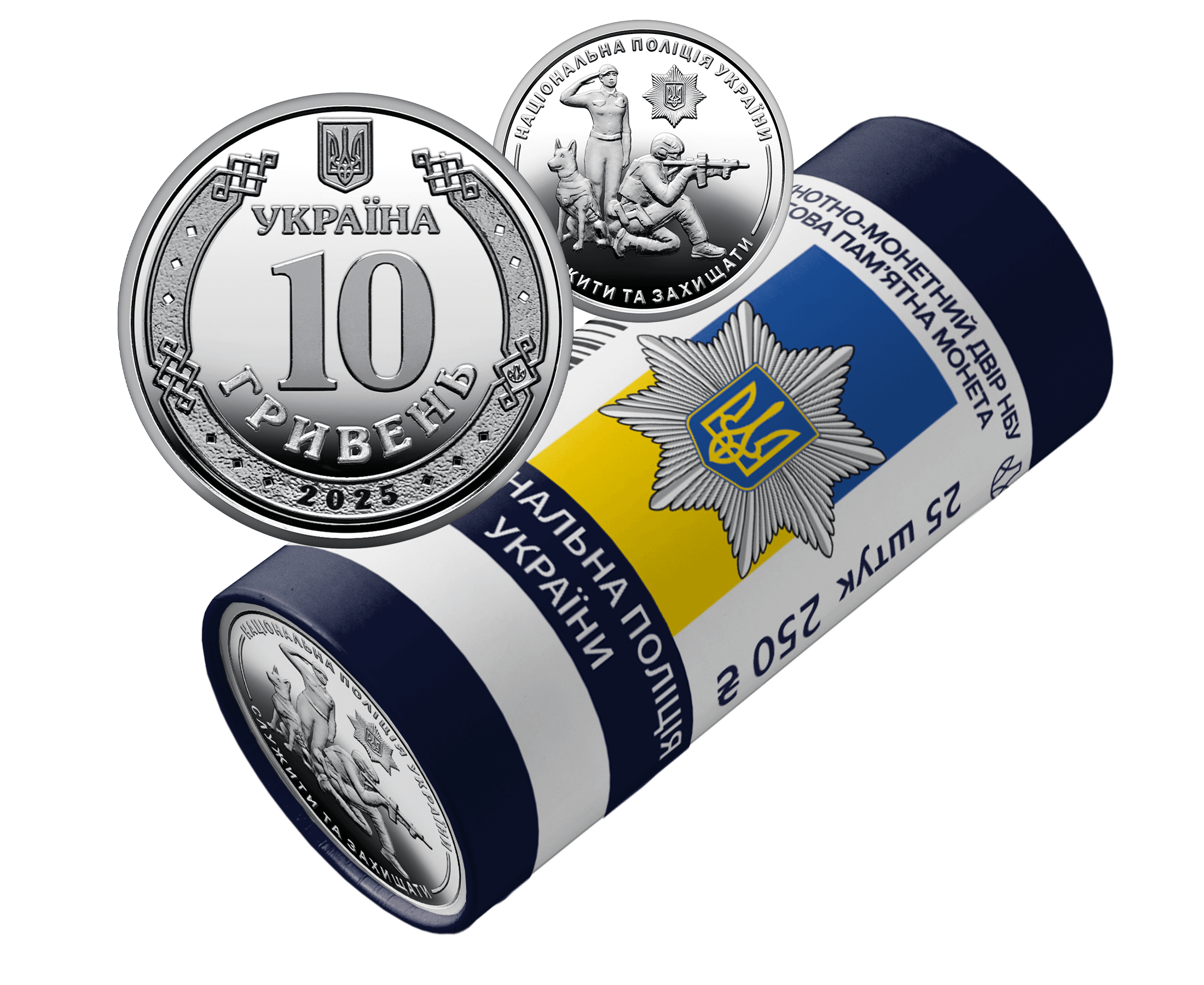 Ролик обігових пам’ятних монет присвячено центральному органу виконавчої влади, що забезпечує охорону прав і свобод людини, протидіє злочинності, підтримує публічну безпеку та правопорядок у державі. Ця монета вшановує професіоналізм, мужність та відданість працівників поліції, які щоденно стоять на сторожі безпеки громадян України. На сувенірному папері, у який запаковано кожний ролик, розміщено написи: БАНКНОТНО-МОНЕТНИЙ ДВІР НБУ, ОБІГОВА ПАМ’ЯТНА МОНЕТА, НАЦІОНАЛЬНА ПОЛІЦІЯ УКРАЇНИ, 25 ШТУК, номінал 250 та графічний знак гривні; логотип Банкнотно-монетного двору Національного банку України, зображення емблеми Національної поліції України на тлі Державного Прапора України.