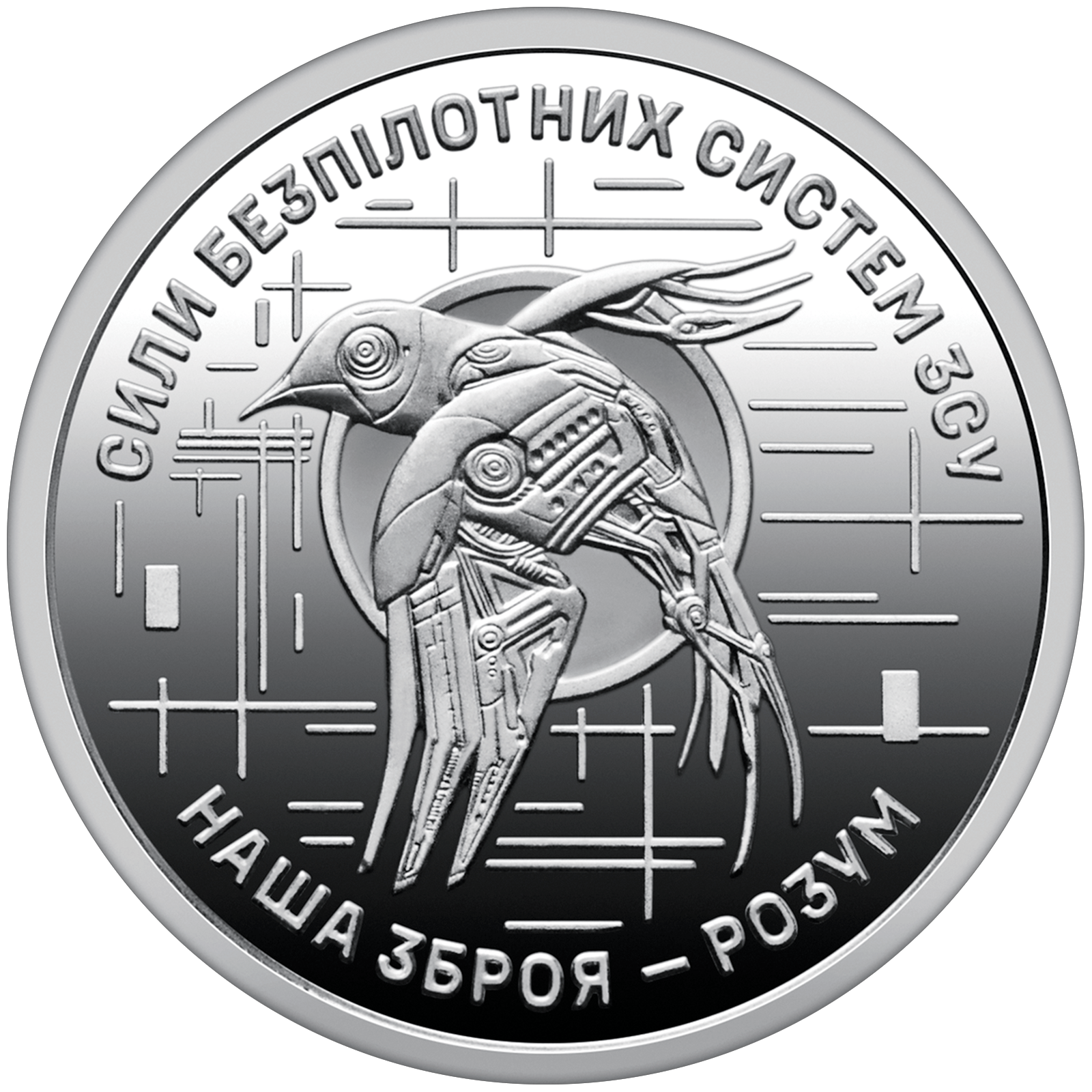 На реверсі монети по колу розміщено написи: СИЛИ БЕЗПІЛОТНИХ СИСТЕМ ЗСУ (угорі) та девіз формування НАША ЗБРОЯ – РОЗУМ (унизу). Головним елементом композиції є емблема Сил безпілотних систем ЗСУ – стилізована сталева ластівка, яка символізує технологічність, швидкість та адаптивність цього роду сил. Тло реверсу доповнене стилізованим зображенням повітряних потоків, що підкреслює динаміку, маневреність та малопомітність безпілотних систем.