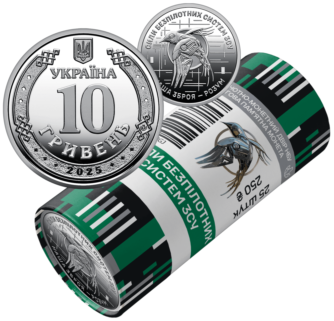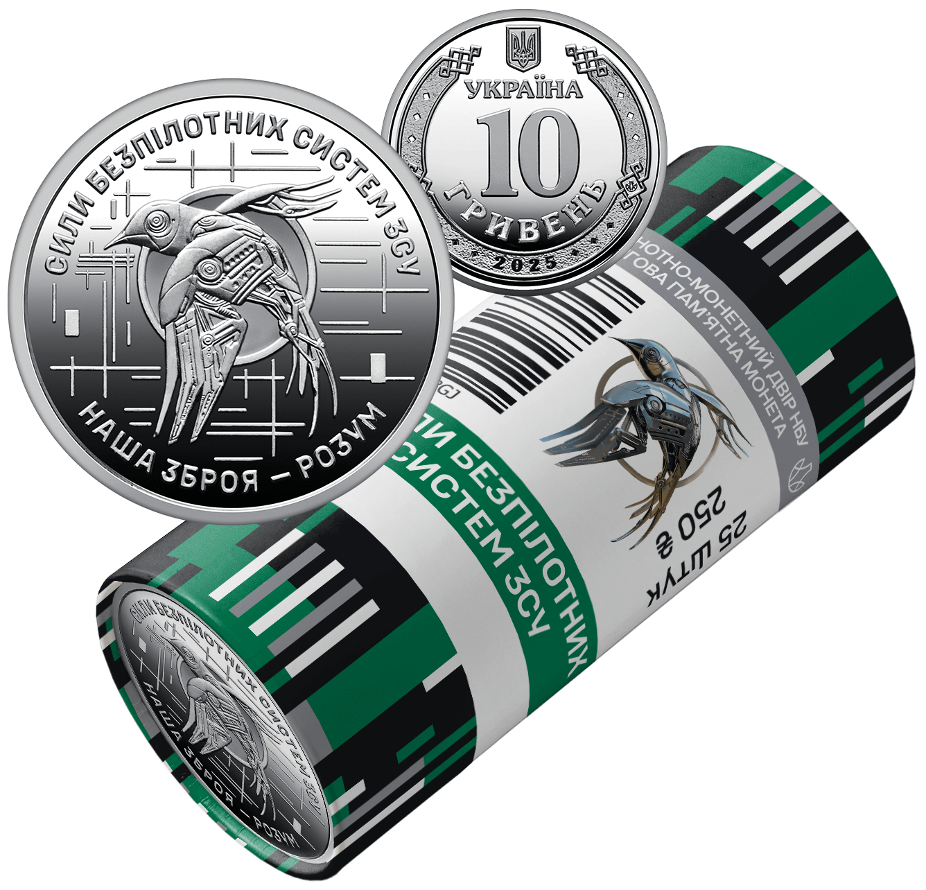 Ролик обігових пам’ятних монет присвячено окремому роду сил, який відіграє ключову роль у сучасних бойових діях. Сили безпілотних систем Збройних Сил України (далі – ЗСУ) системно застосовують повітряні, морські, а також наземні безпілотні та роботизовані системи для реалізації широкого спектра бойових завдань в умовах асиметричного протистояння. Ця монета вшановує внесок особового складу Сил безпілотних систем ЗСУ у захист територіальної цілісності України, символізуючи інноваційність, технологічну перевагу та інтелект українського війська. На сувенірному папері, у який запаковано кожний ролик, розміщено написи: БАНКНОТНО-МОНЕТНИЙ ДВІР НБУ, ОБІГОВА ПАМ’ЯТНА МОНЕТА, СИЛИ БЕЗПІЛОТНИХ СИСТЕМ ЗСУ, 25 ШТУК, номінал 250 та графічний знак гривні; логотип Банкнотно-монетного двору Національного банку України, зображення емблеми Сил безпілотних систем ЗСУ на тлі стилізованих повітряних потоків.