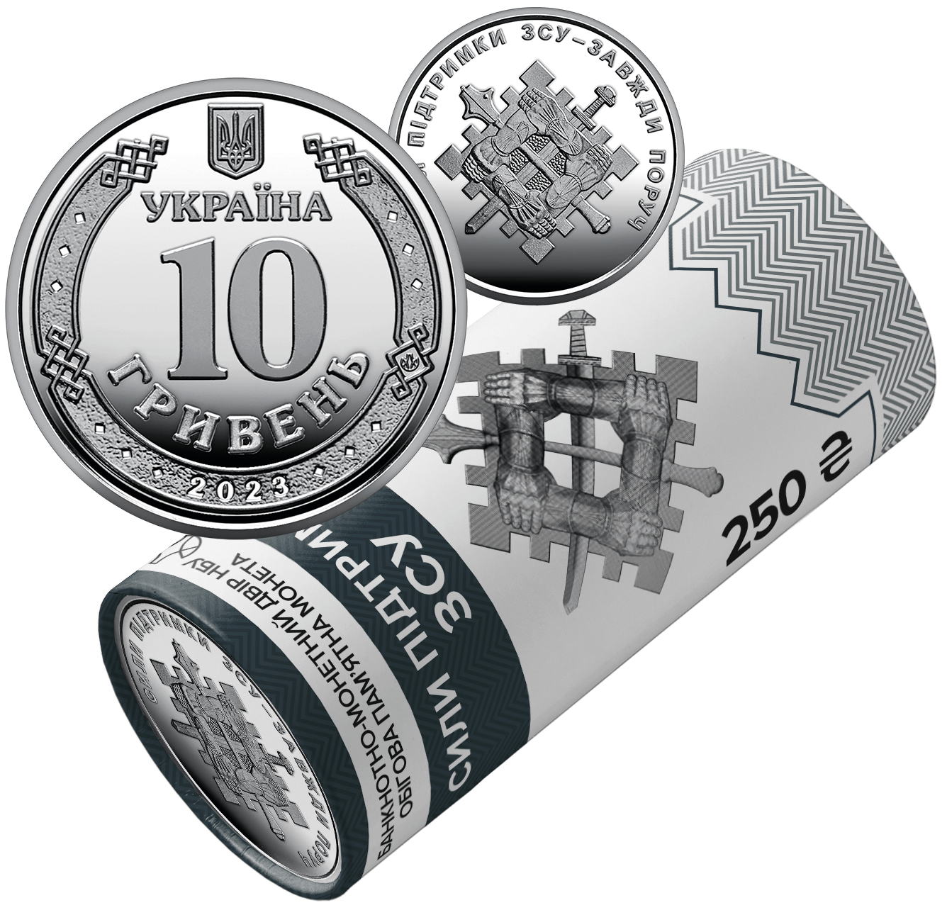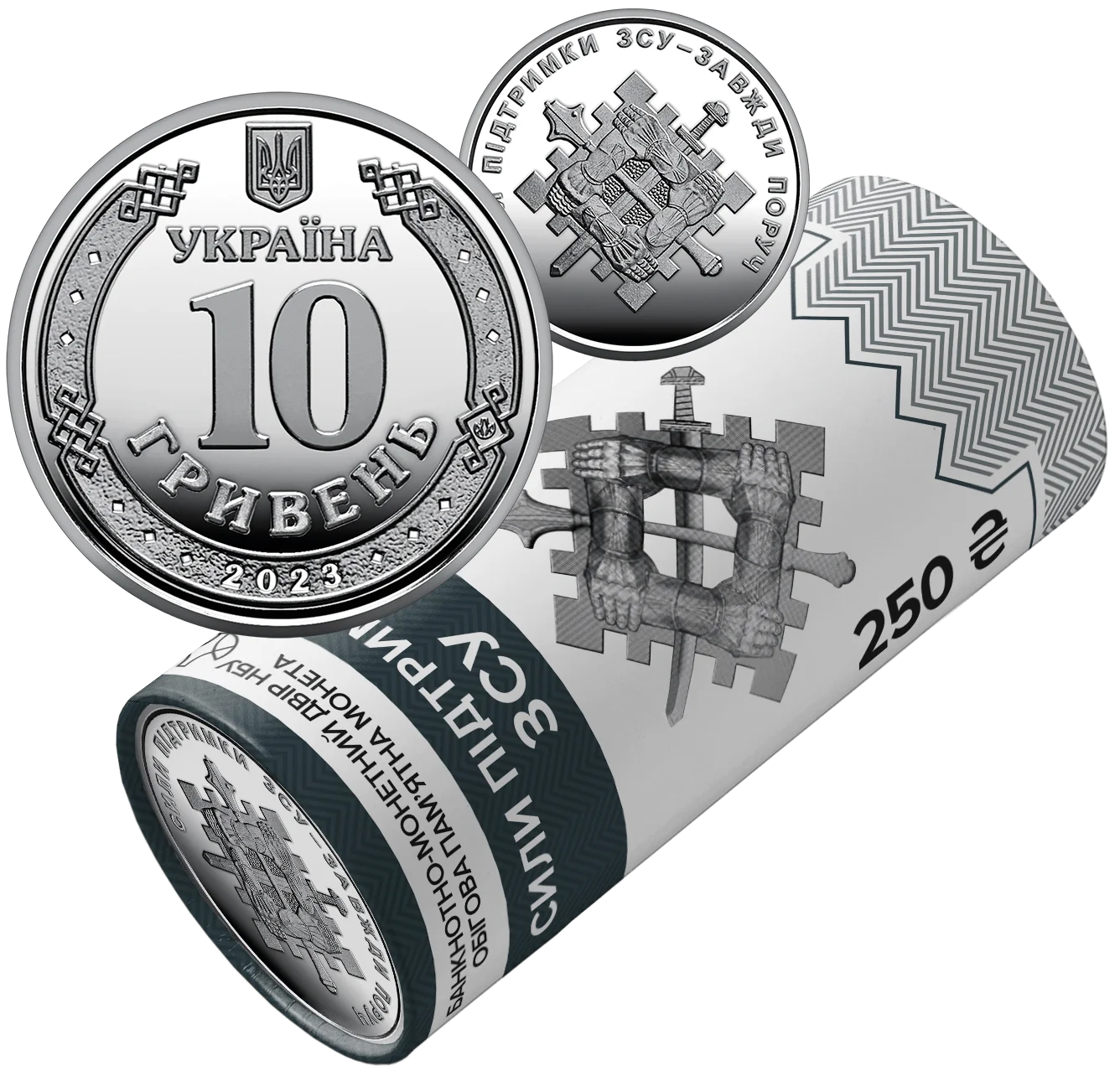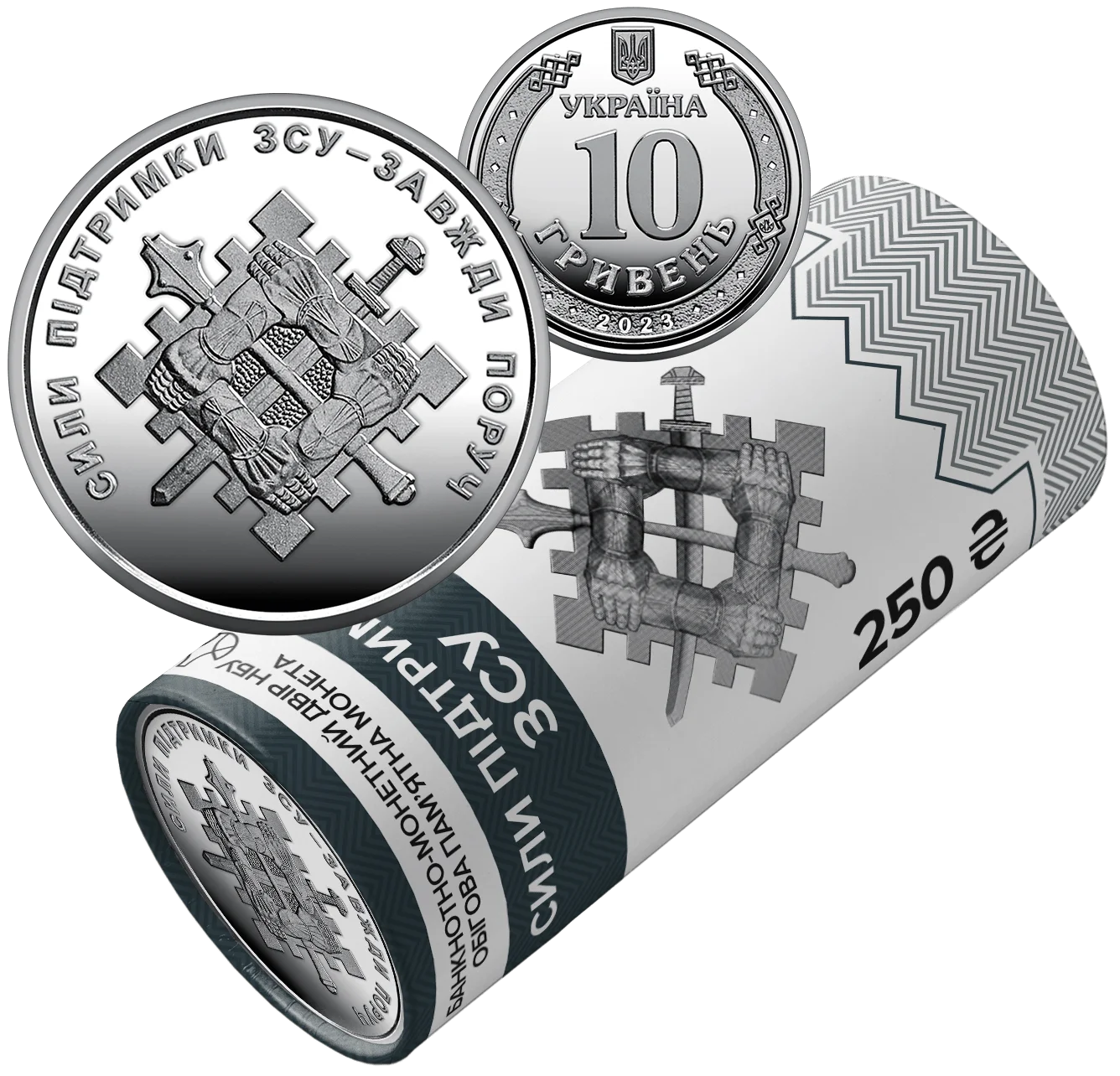 Присвячений окремому роду сил Збройних Сил України - Силам підтримки, на який покладається оперативне забезпечення інженерної підтримки, радіаційного, хімічного та біологічного захисту, топографічного та гідрометеорологічного забезпечення військ. На сувенірному папері, у який запаковано кожний ролик, розміщено написи: БАНКНОТНО-МОНЕТНИЙ ДВІР НБУ, логотип Банкнотно-монетного двору Національного банку України / ОБІГОВА ПАМ’ЯТНА МОНЕТА, СИЛИ ПІДТРИМКИ / ЗСУ; номінал 250 та графічний символ гривні, 25 ШТУК; зображено емблему Сил підтримки ЗСУ та стилізовану старовинну оборонну споруду – палісад.