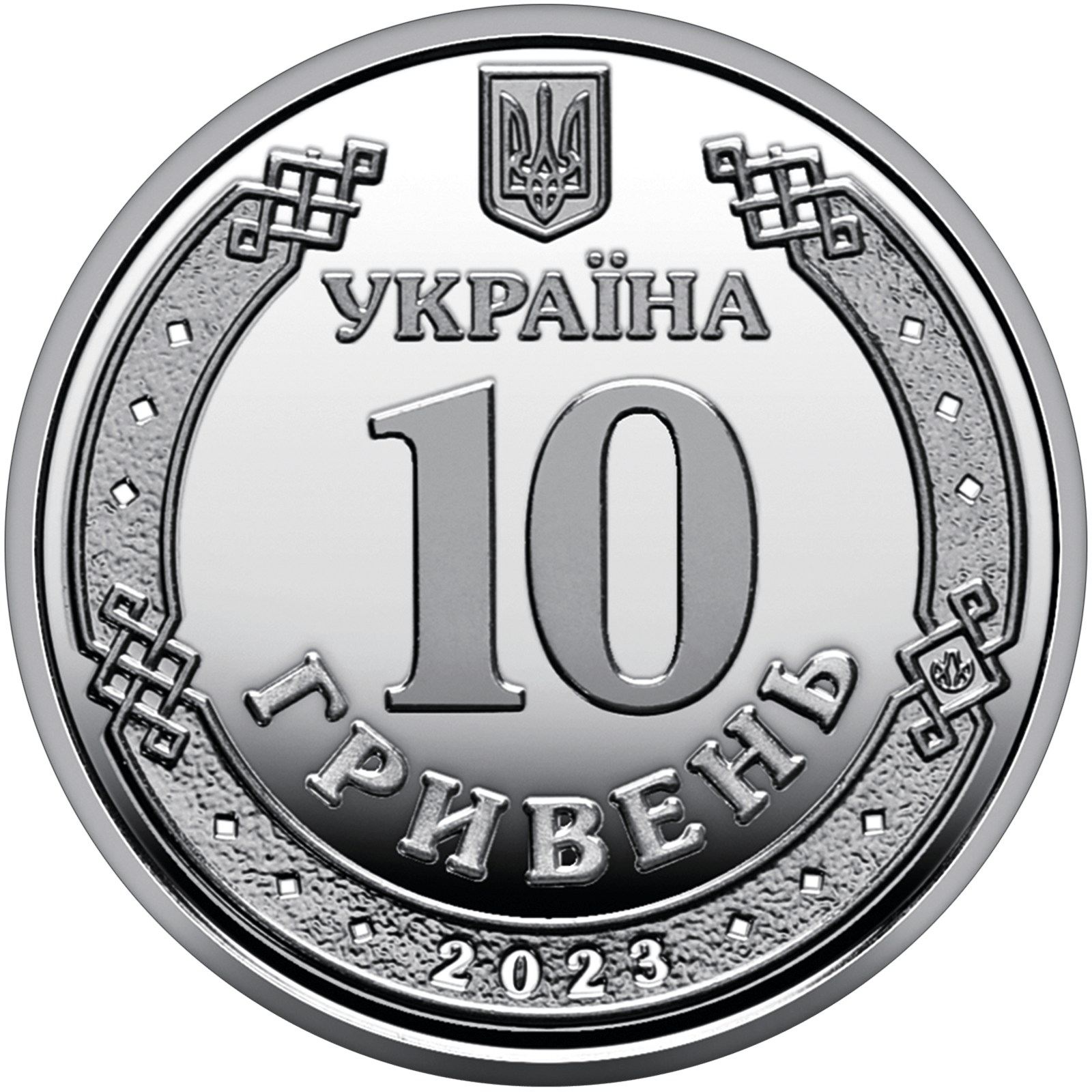 На аверсі монети розміщено: угорі – малий Державний Герб України, у центрі, в обрамленні давньоруського орнаменту написи: УКРАЇНА / 10 / ГРИВЕНЬ (півколом), на тлі орнаменту: рік карбування монети – 2023 (унизу) та логотип Банкнотно-монетного двору Національного банку України (праворуч).