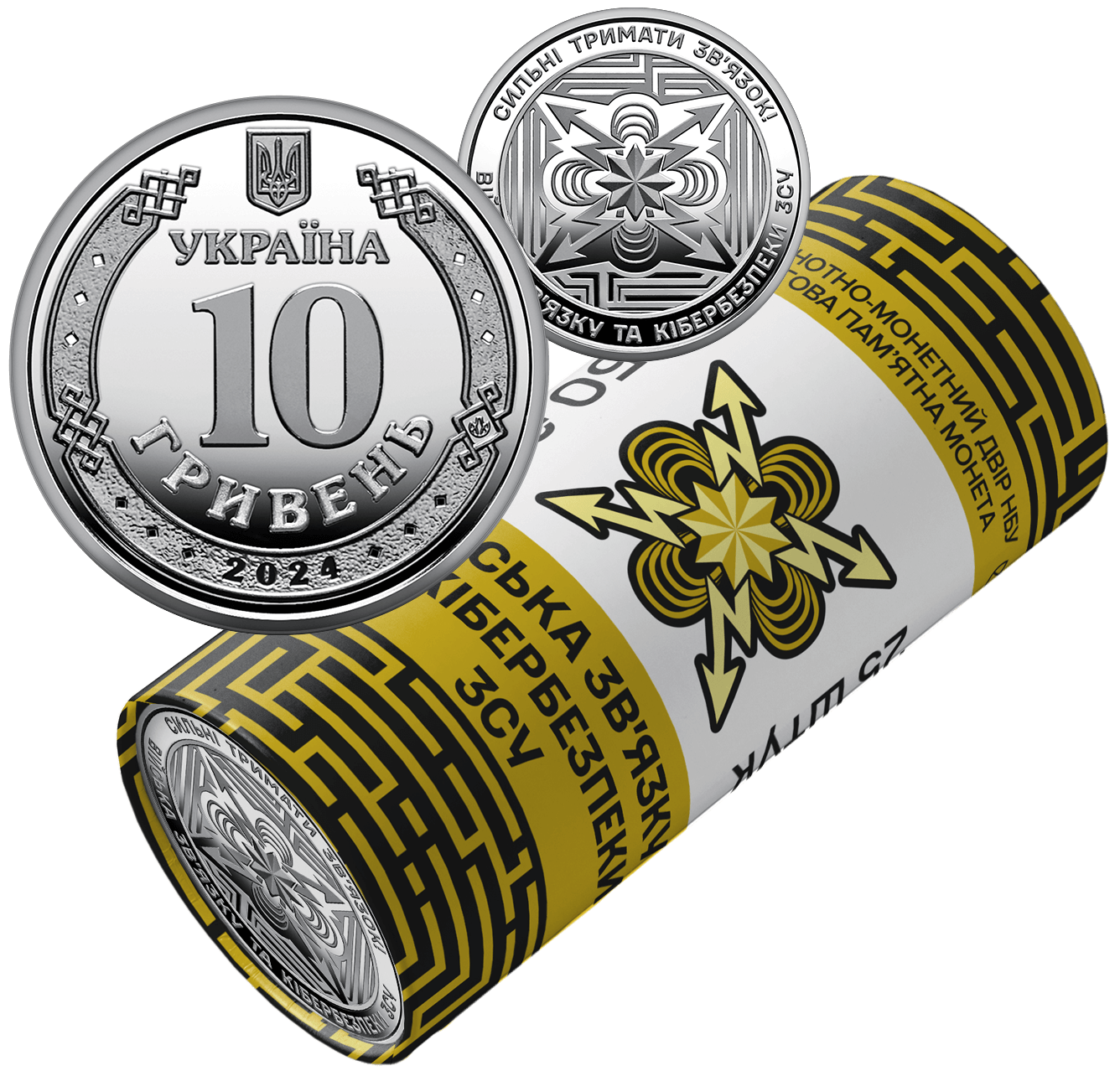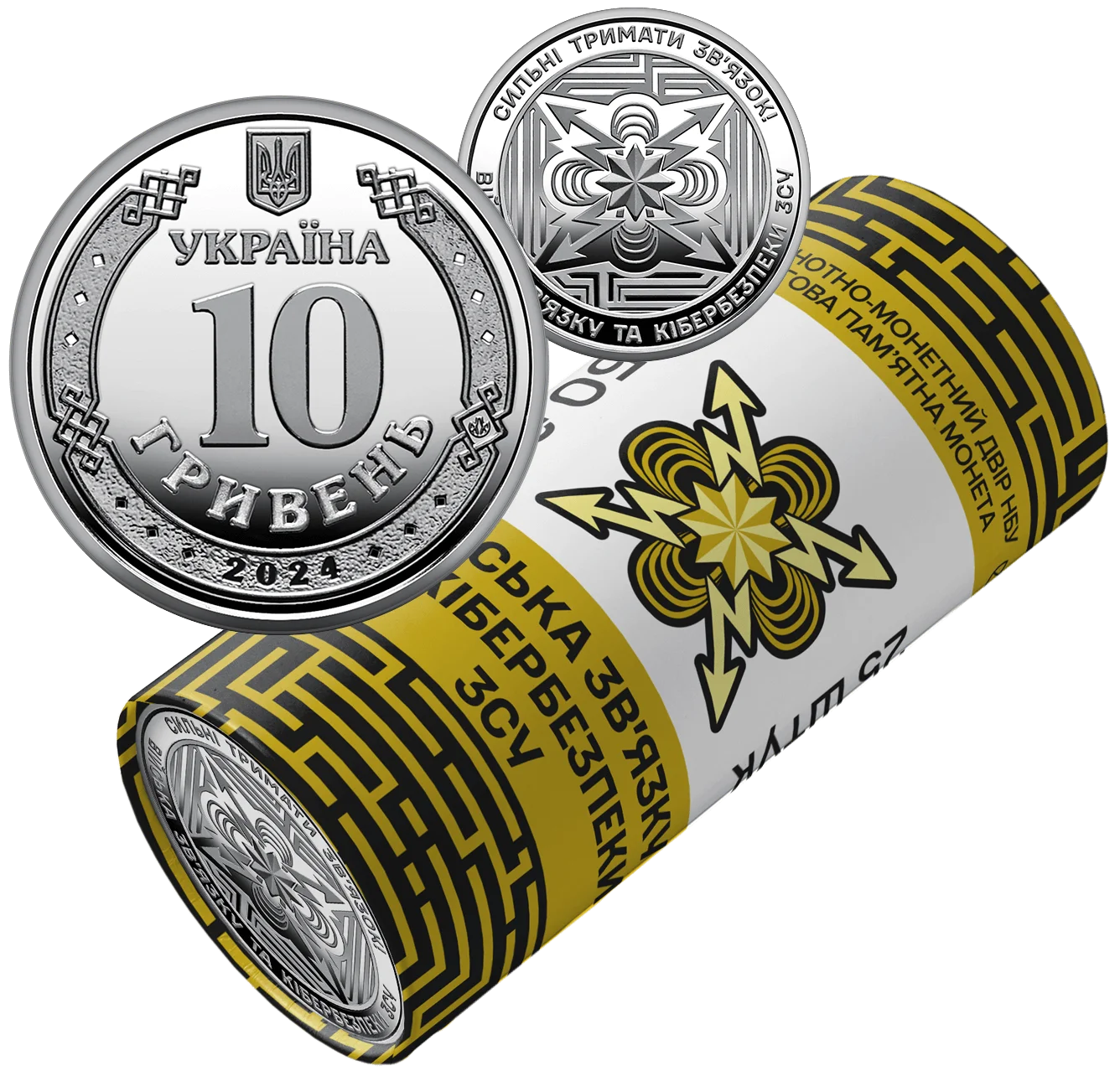 Ролик обігових пам’ятних монет “Війська зв’язку та кібербезпеки Збройних Сил України”, присвячений українським воїнам-зв’язківцям, які щодня забезпечують комунікацію та управління військами, долають надскладні виклики і загрози, щоб захистити Україну в інформаційному та кіберпросторі. Війська зв’язку та кібербезпеки – це спеціальні війська, які відповідають за планування, розгортання й забезпечення функціонування засобів зв’язку та інформаційних систем, систем бойового управління та оповіщення. Вони гарантують ефективний обмін даними між військовими підрозділами й забезпечують кібербезпеку в умовах надзвичайного чи воєнного стану. На сувенірному папері, у який запаковано кожний ролик, розміщено написи: БАНКНОТНО-МОНЕТНИЙ ДВІР НБУ, ОБІГОВА ПАМ’ЯТНА МОНЕТА, ВІЙСЬКА ЗВ’ЯЗКУ ТА КІБЕРБЕЗПЕКИ ЗСУ, 25 ШТУК, номінал 250 та графічний символ гривні; логотип Банкнотно-монетного двору Національного банку України, зображення емблеми Військ зв’язку та кібербезпеки ЗСУ, елементи, які імітують лабіринти зашифрованих даних.