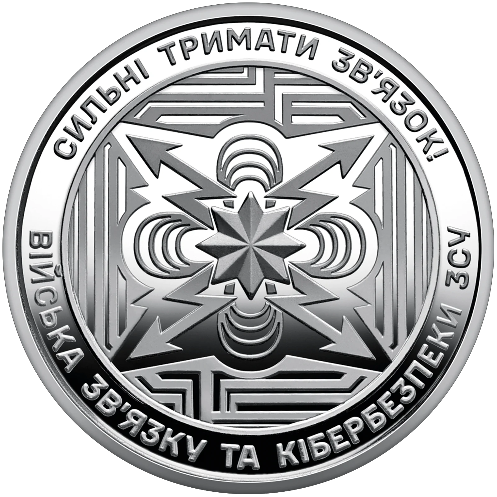 На реверсі монети по колу розміщено написи: СИЛЬНІ ТРИМАТИ ЗВ’ЯЗОК! і ВІЙСЬКА ЗВ’ЯЗКУ ТА КІБЕРБЕЗПЕКИ ЗСУ. У центрі композиції, немов щит, що захищає інформаційний простір, зображено емблему Військ зв’язку та кібербезпеки Збройних Сил України, в її основі – восьмипроменева зірка в оточенні хрестоподібно розташованих орбіт та перехрещених блискавок. На задньому плані монети схематично зображені лабіринти, які символізують передавання зашифрованих даних через заплутані захисні системи кіберпростору, де точиться невидима війна.