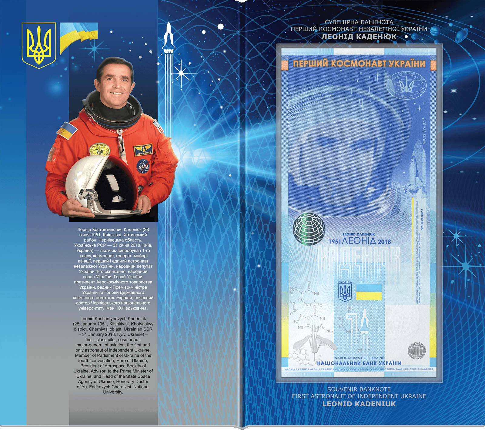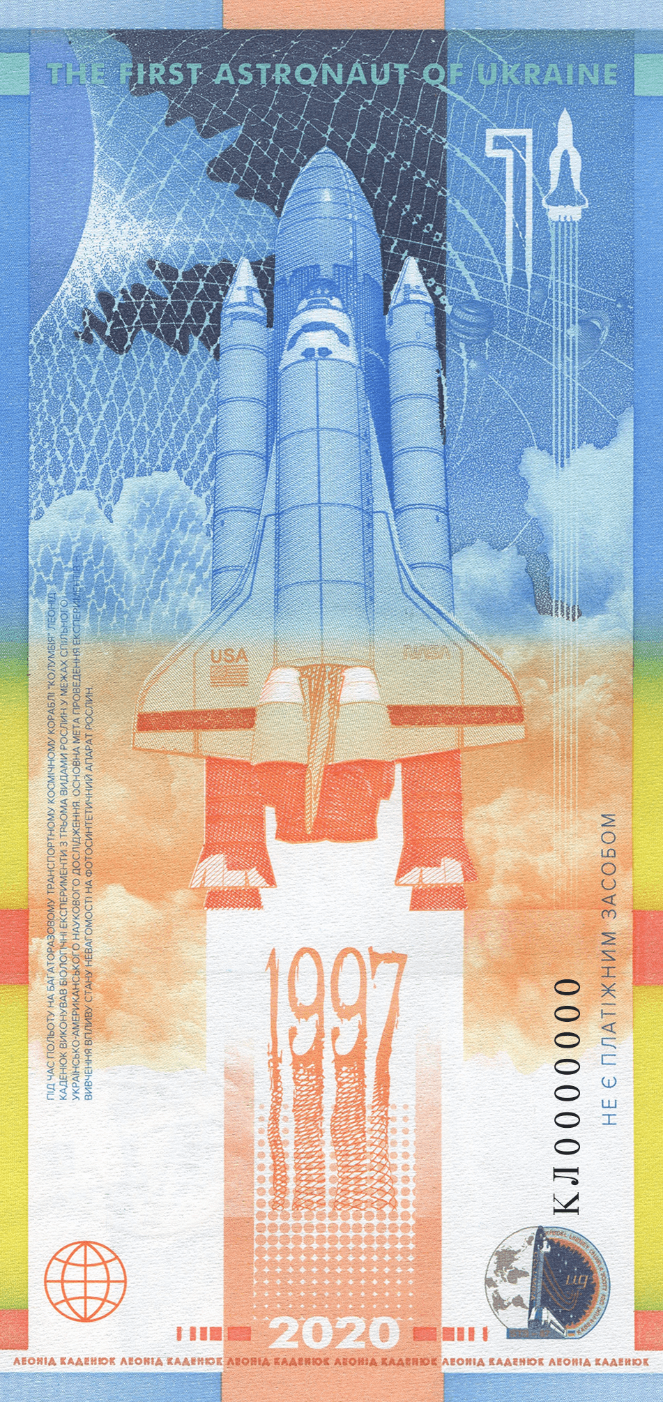Сувенірна банкнота присвячена Герою України, першому космонавту незалежної України Леоніду Костянтиновичу Каденюку, який у 1997 році здійснив політ на американському космічному шатлі “Колумбія” (місія STS-87) у складі міжнародного екіпажу. Український космонавт-дослідник виконав широкий спектр робіт у рамках спільного українсько-американського експерименту, завданням якого було дослідження впливу мікрогравітації на ріст і розвиток вищих рослин. Сувенірна банкнота виготовлена на папері з водяним знаком (зображення земної кулі з материками), у товщу паперу введено 1,5-міліметрову захисну стрічку паралельно меншій стороні банкноти і захисні волокна, що набувають флуоресцентного світіння під дією ультрафіолетових променів. Сувенірну банкноту віддруковано за допомогою офсетного, інтагліо, трафаретного та високого способів друку з використанням захищених фарб. Розміри сувенірної банкноти 80 х 170 мм.