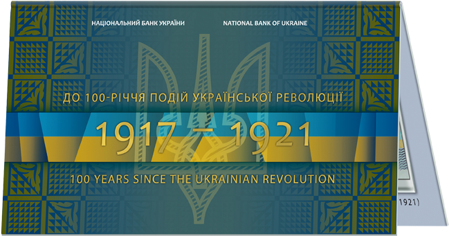 Основне зображення лицьового боку сувенірної банкноти - банкнота 1918 року номіналом 100 гривень (лицьовий бік), ліворуч від якої написи: НЕ Є ПЛАТІЖНИМ ЗАСОБОМ (вертикальний напис), УКРАЇНА (угорі), До подій/ Української/ революції/ 1917 - 1921 (унизу); тризуб - історичний символ, який розташований на банкноті 1918 року, та рік друкування банкноти - 2018. Ліворуч від основного зображення (унизу) - оптично-змінне зображення 100 РОКІВ, колір якого під час зміни кута нахилу банкноти змінюється від золотистого до зеленого. Біля правого краю сувенірної банкноти розміщено частину наскрізного елемента 1918 сіро-синього кольору та латентне зображення 100, приховане в коричнево-фіолетовому квадраті.