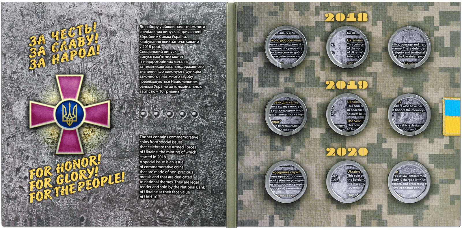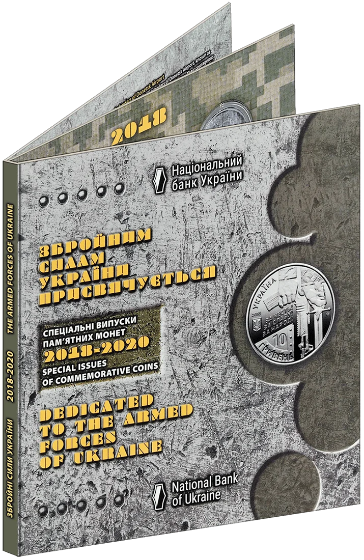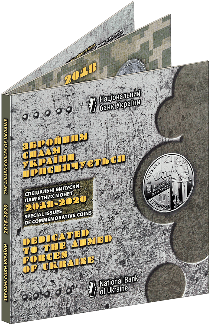 Сувенірна упаковка призначається для вкладення 9-ти пам’ятних монет спеціальних випусків, присвячених Збройним Силам України, випущених протягом 2018-2020 років. Габаритні розміри упаковки 190х190х7 мм. Упаковка має 9–ять пластикових обжимних футлярів для розміщення монет діаметром 30 мм наступних найменувань: «Захисникам Донецького аеропорту», «День українського добровольця», «100-річчя створення Українського військово-морського флоту», «На варті життя», «Учасникам бойових дій на території інших держав», «КрАЗ 6322 «Солдат», «Повітряні Сили Збройних Сил України», «Державна прикордонна служба України», День пам’яті полеглих захисників України». Упаковка містить інформацію українською та англійською мовами, а також технічні характеристики монет.