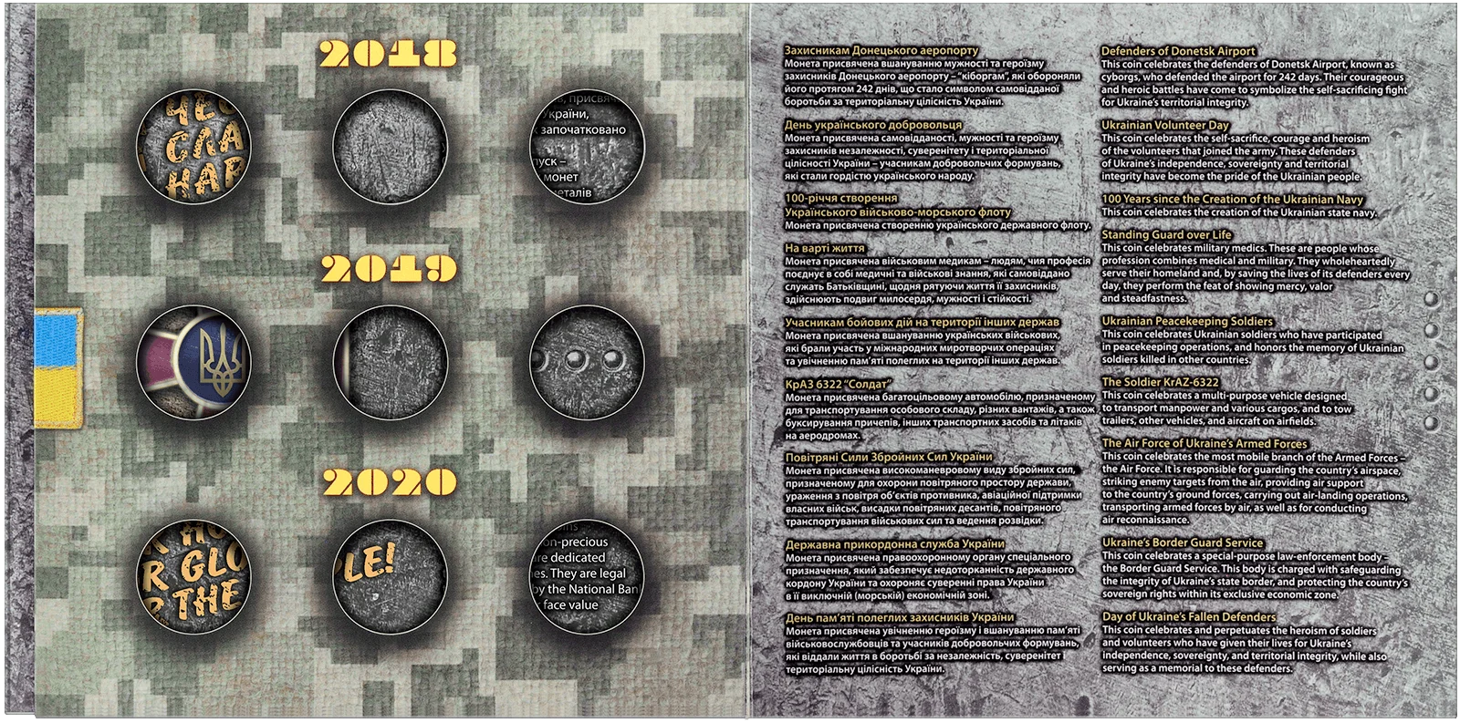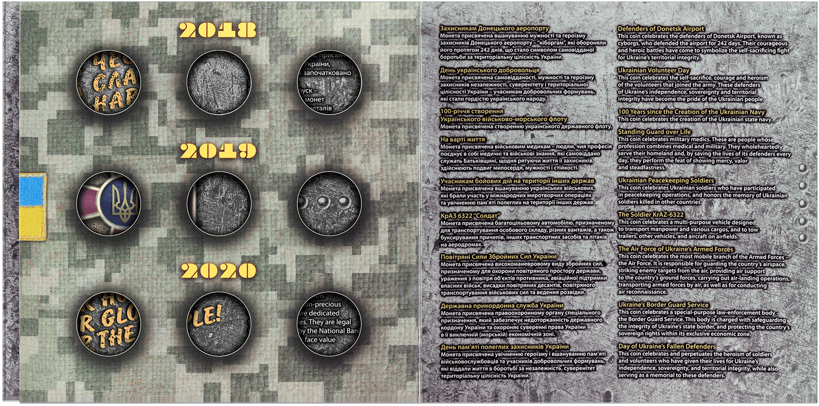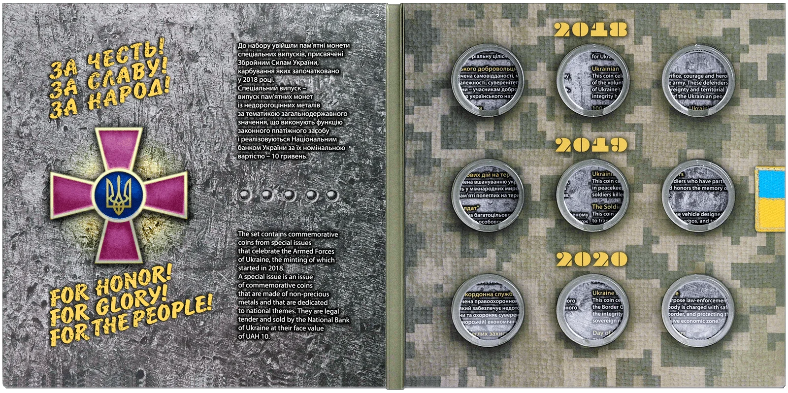 Сувенірна упаковка призначається для вкладення 9-ти пам’ятних монет спеціальних випусків, присвячених Збройним Силам України, випущених протягом 2018-2020 років. Габаритні розміри упаковки 190х190х7 мм. Упаковка має 9–ять пластикових обжимних футлярів для розміщення монет діаметром 30 мм наступних найменувань: «Захисникам Донецького аеропорту», «День українського добровольця», «100-річчя створення Українського військово-морського флоту», «На варті життя», «Учасникам бойових дій на території інших держав», «КрАЗ 6322 «Солдат», «Повітряні Сили Збройних Сил України», «Державна прикордонна служба України», День пам’яті полеглих захисників України». Упаковка містить інформацію українською та англійською мовами, а також технічні характеристики монет.