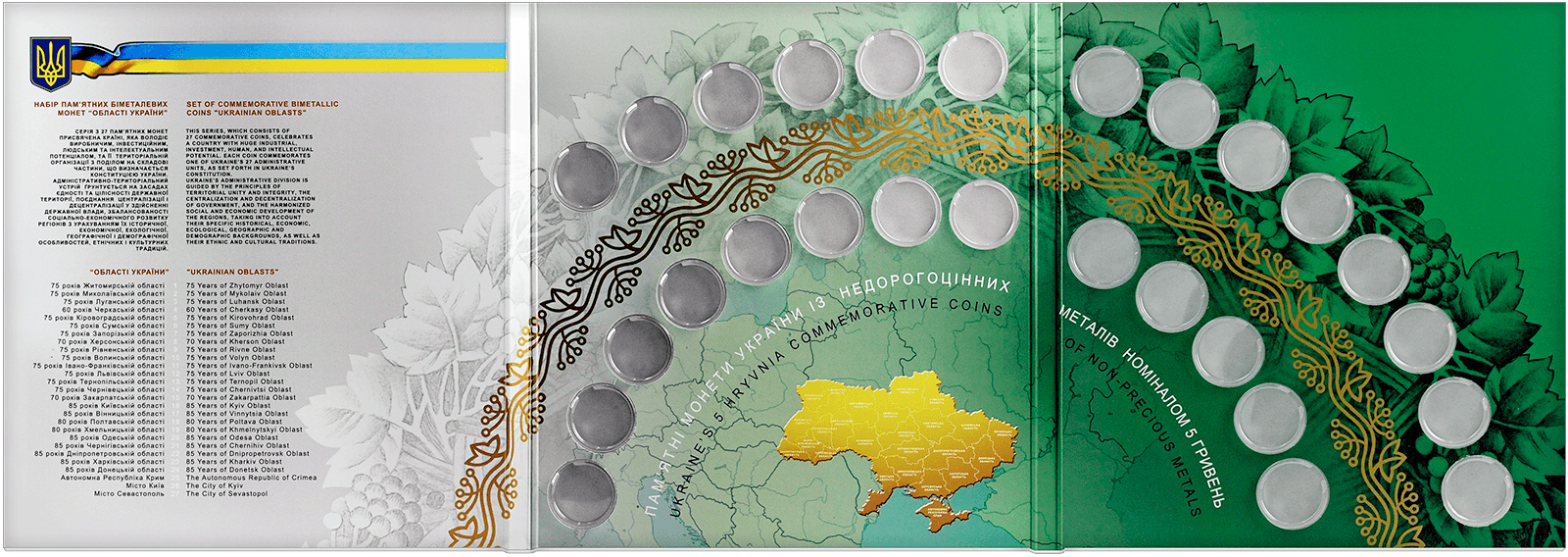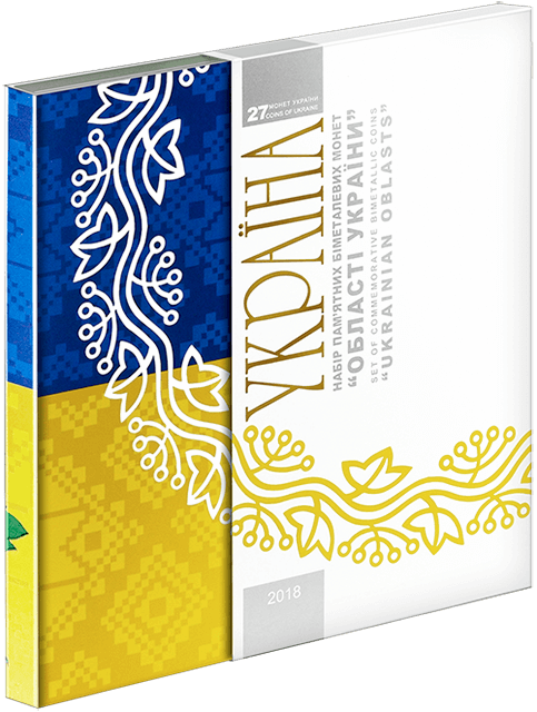 Сувенірна упаковка для набору з 27 пам’ятних біметалевих монет діаметром 28 мм номіналом 5 гривень «Області України». Упаковка містить описову частину українською та англійською мовами набору з переліком назв 27 пам’ятних біметалевих монет, та спеціальних 27 отворів з прозорого пластику для вкладання монет. Зі зворотної частини упаковки у колі розміщені герби кожної області з відповідними написами. Упаковка вкладається у конверт, який містить написи українською та англійською мовами «Україна. Набір пам’ятних біметалевих монет. «Області України».