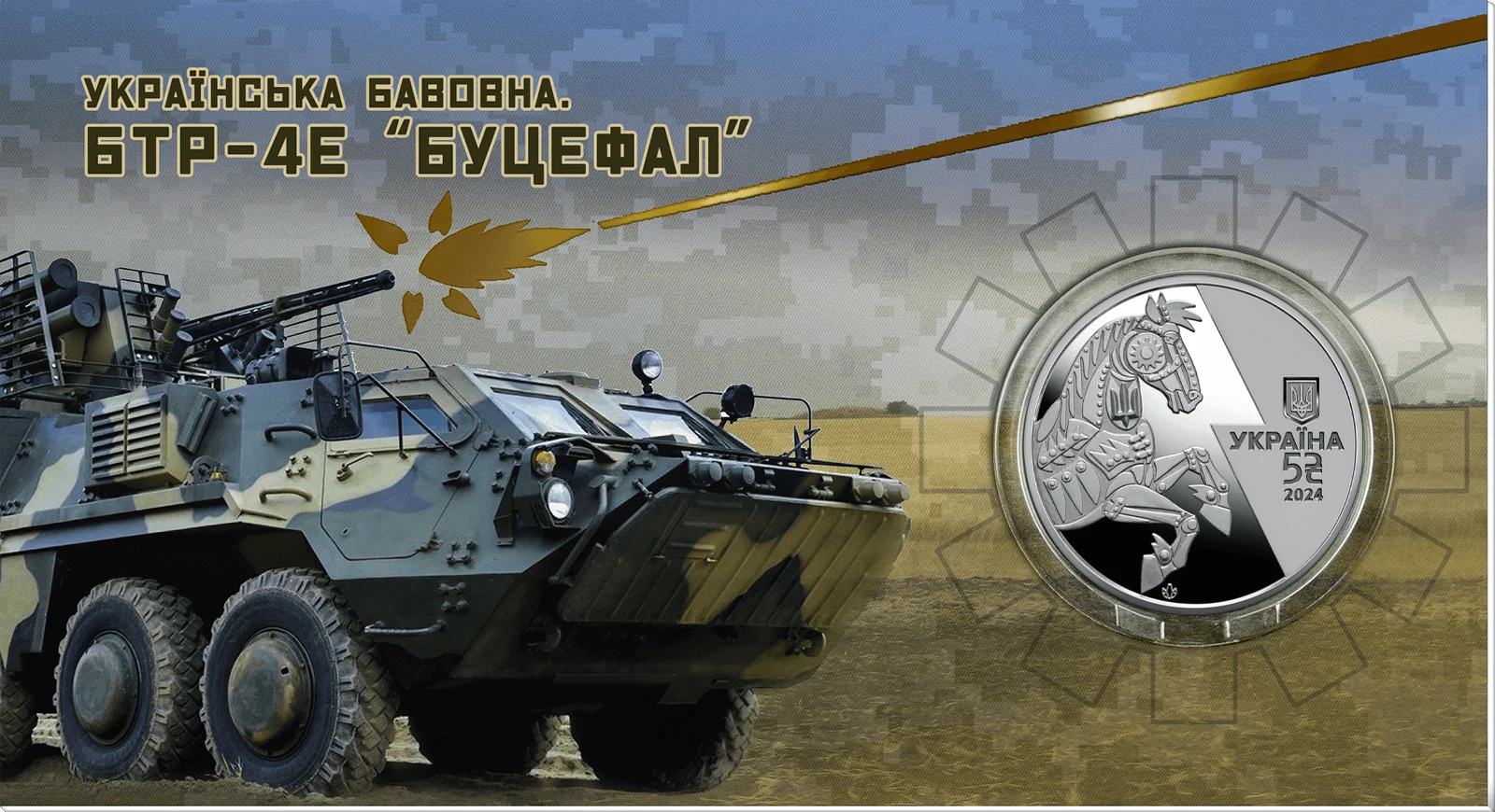 Пам`ятна монета присвячена бронетранспортеру нового покоління, який демонструє високі можливості українського машинобудування. Ця бойова повнопривідна броньована машина поєднує в собі високий рівень захисту, потужне озброєння та відмінну мобільність, що робить її незамінною для Збройних Сил та Національної гвардії України.
