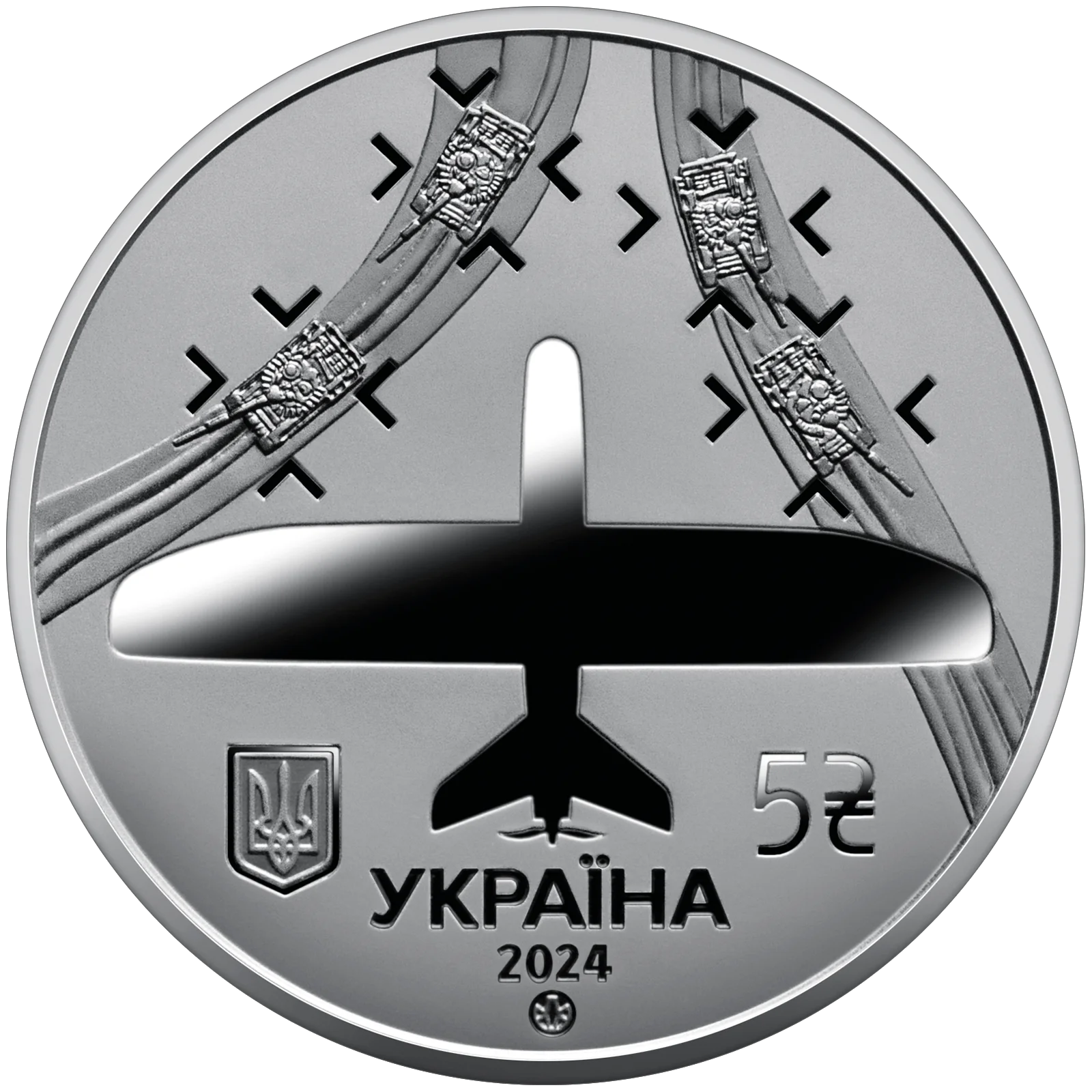 відображені виявлені ворожі цілі – танки. У центрі – абрис планера комплексу, який втілює технологічний прогрес та інноваційний потенціал України. Унизу ліворуч на дзеркальному тлі – малий Державний Герб України, праворуч – номінал монети 5 та графічний знак гривні, під безпілотним комплексом по центру викарбувано напис УКРАЇНА, рік карбування монети 2024 і логотип Банкнотно-монетного двору Національного банку України.