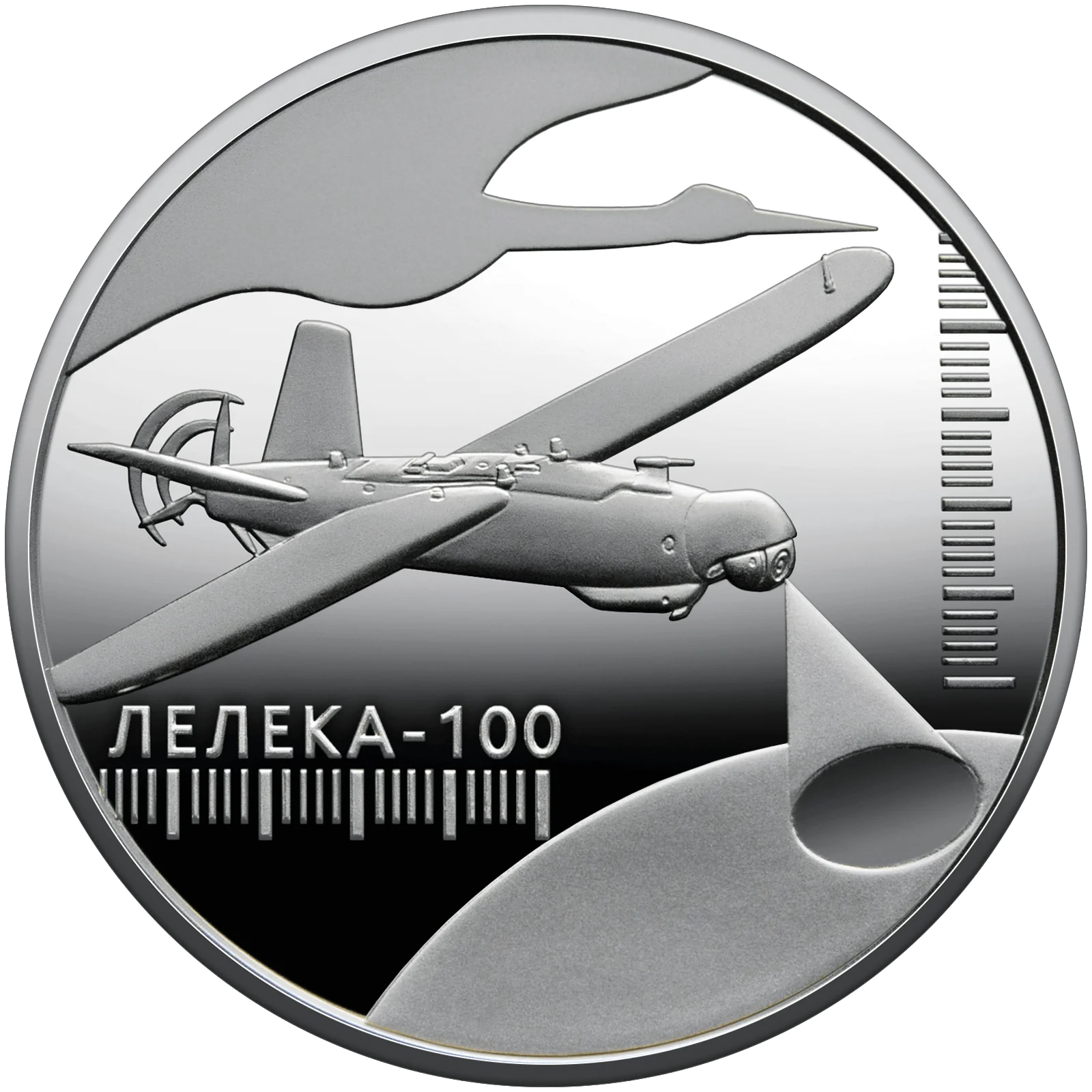 На реверсі монети зображено планер розвідувального комплексу в польоті. Над ним – стилізований абрис птаха лелеки, що символізує мир та спокій, які забезпечуються завдяки пильності “Лелеки-100”. У нижній частині композиції – вид земної поверхні з умовною схемою візуального дослідження