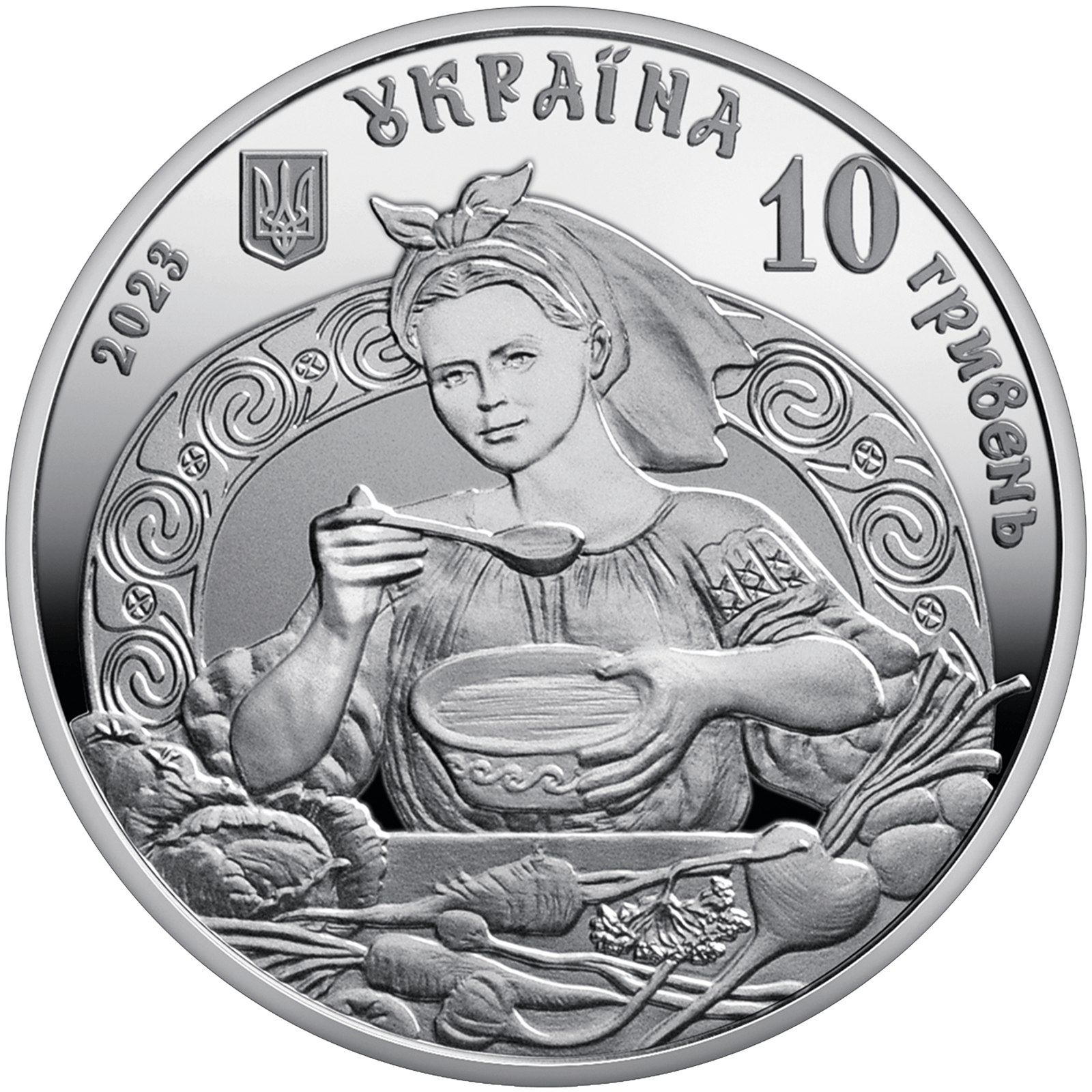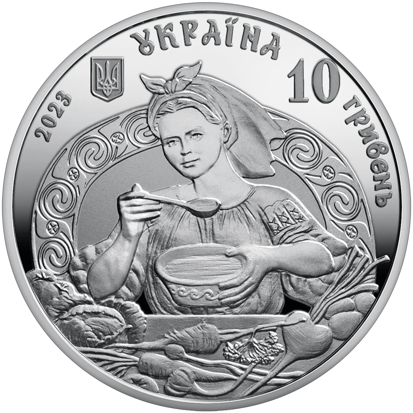 На аверсі монети розміщено: угорі малий Державний Герб України, ліворуч і праворуч від якого написи півколом: УКРАЇНА, рік карбування монети – 2023; номінал монети – 10/ГРИВЕНЬ; у центрі зображено господиню під час приготування українського борщу на тлі печі, що символізує неперервність життя народу, тепло, затишок, добробут, родинне щастя, оздоблену орнаментом за трипільським мотивом, який уособлює вікову історію і традицію приготування борщу.