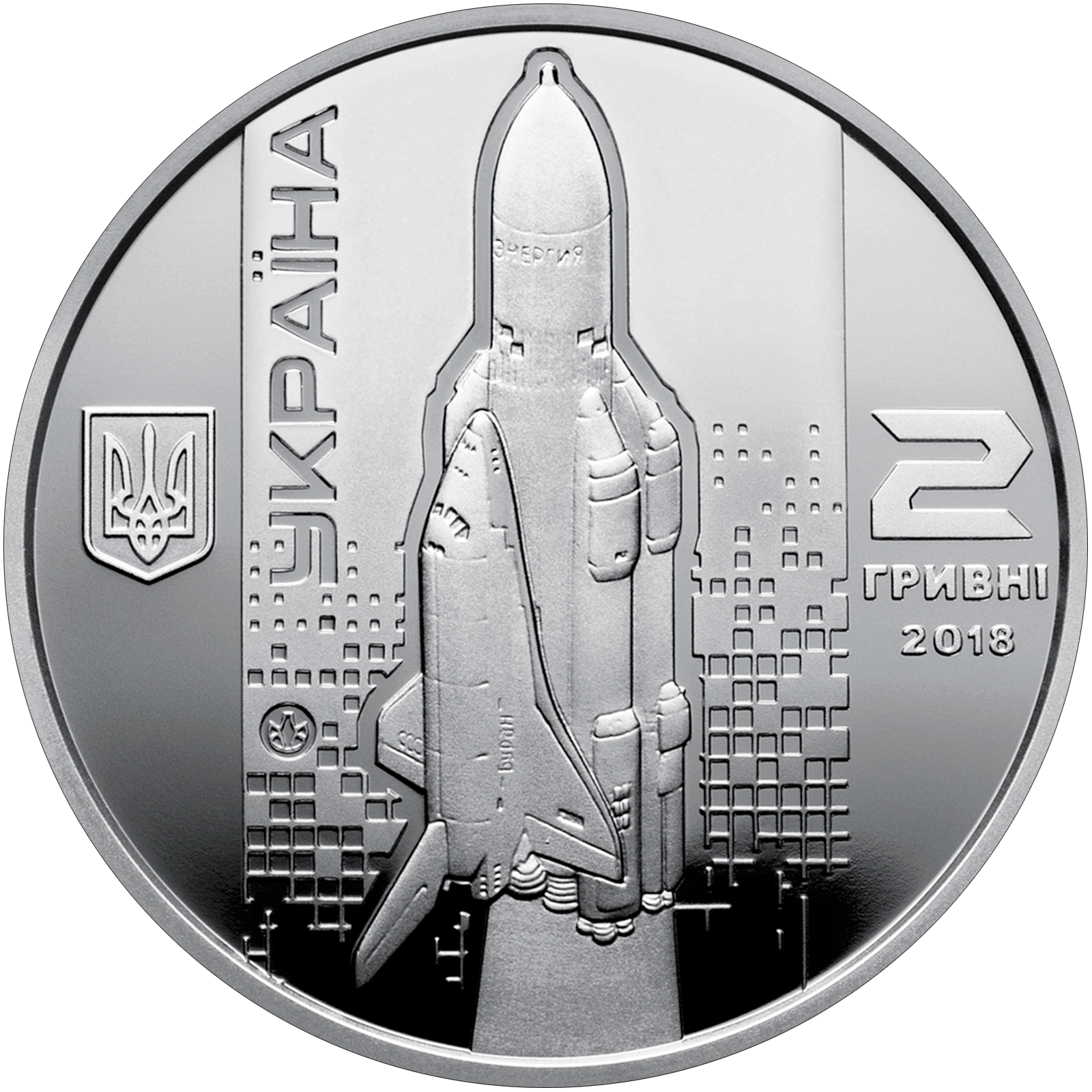 На аверсі монети розміщено: ліворуч: малий Державний Герб України, праворуч від якого напис: УКРАЇНА (вертикально), під яким - логотип Банкнотно-монетного двору Національного банку України; у центрі - стилізовану композицію: ракетно-космічна система `Енергія - Буран` під час зльоту; праворуч: номінал - 2/ГРИВНІ та рік карбування монети - 2018.