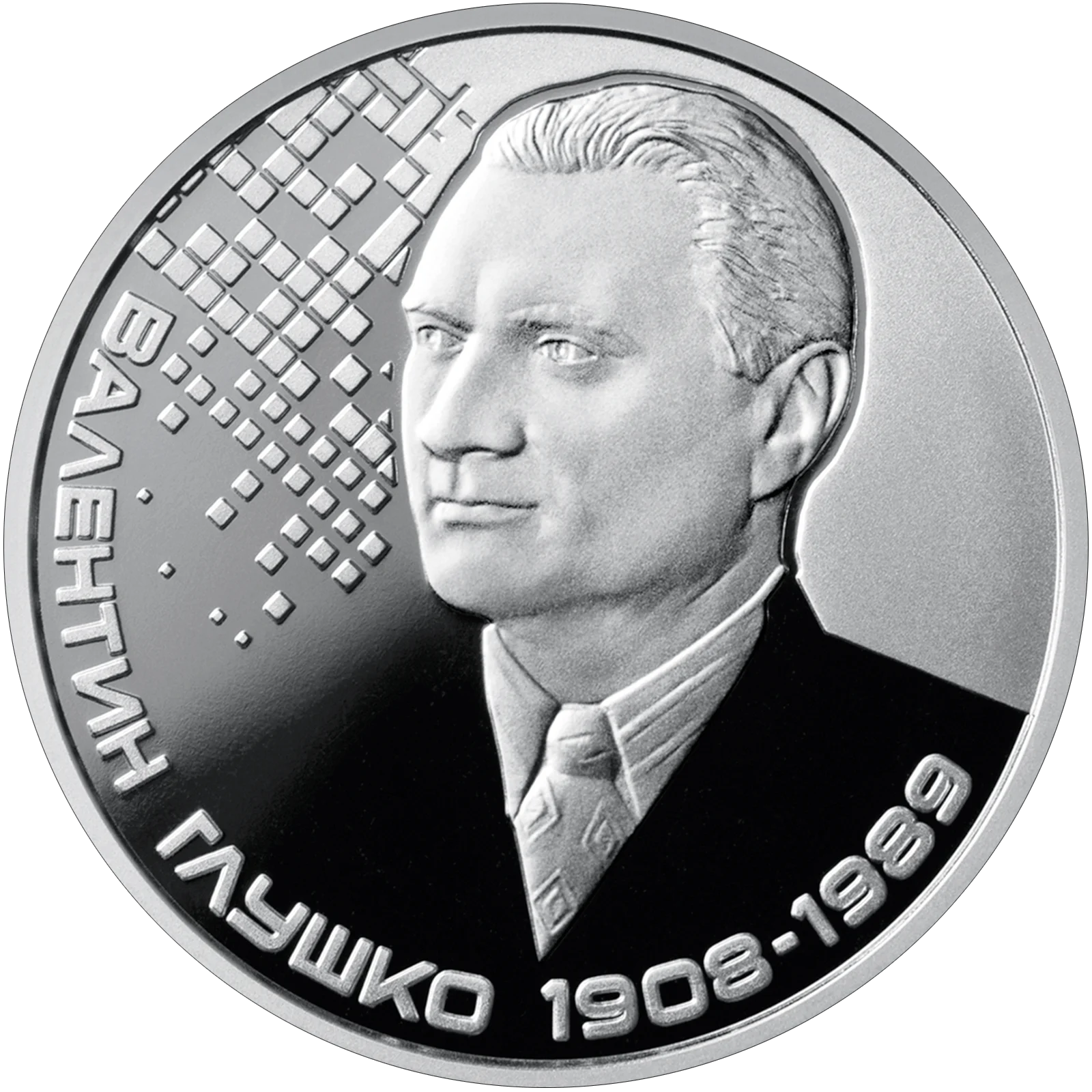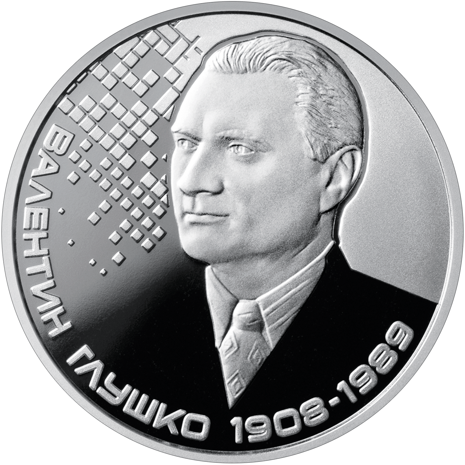 На реверсі монети зображено портрет Валентина Глушка та внизу півколом розміщено написи: ВАЛЕНТИН ГЛУШКО та роки його життя 1908 - 1989.