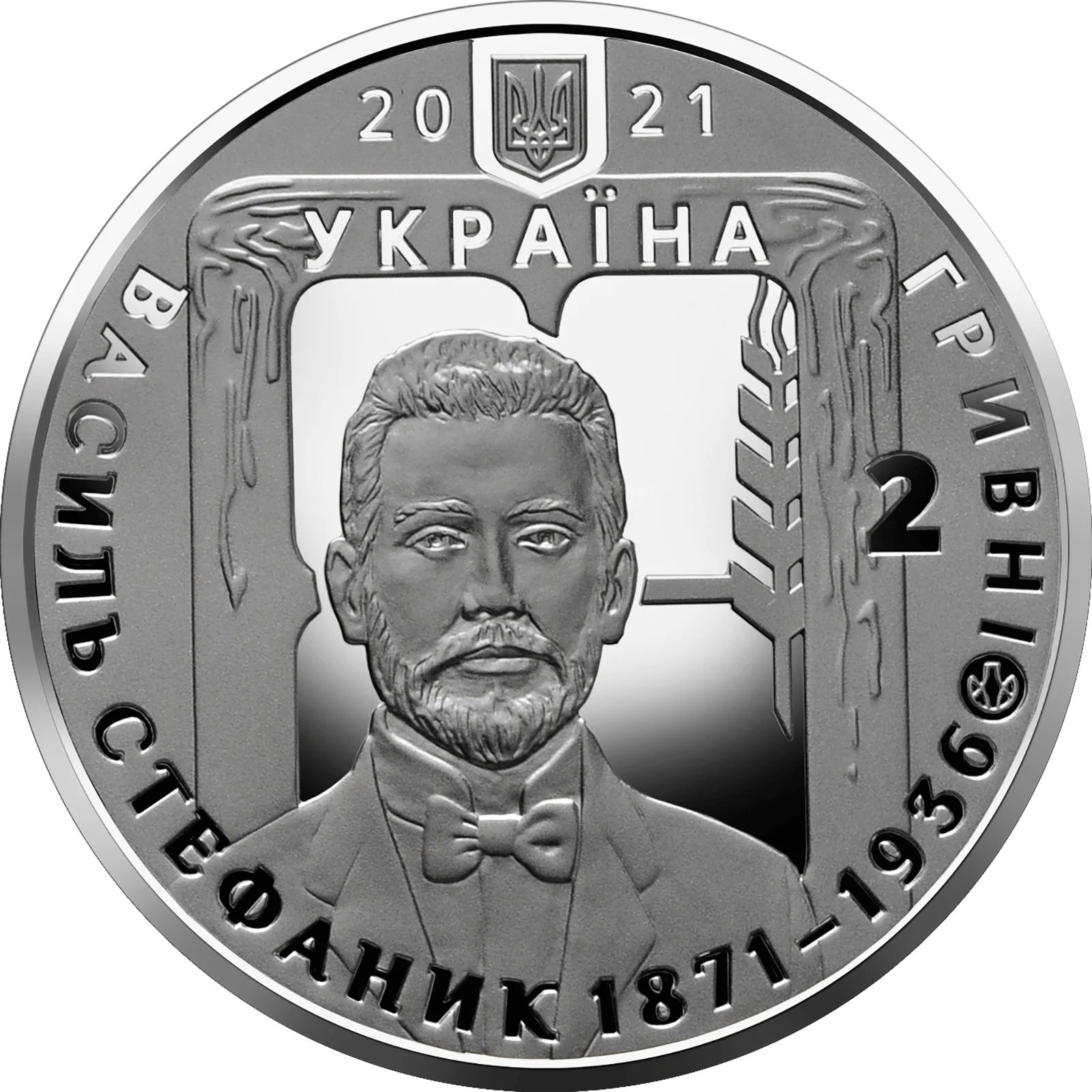 На аверсі монети розміщено: угорі – малий Державний Герб України, по обидва боки від якого – 2021; у центрі – стилізовану композицію: на тлі вікна сільської хати – портрет Василя Стефаника, праворуч від якого – колосок, що символізує письменницьке перо; написи: УКРАЇНА (над портретом), номінал – 2 (праворуч), ГРИВНІ (півколом праворуч), ВАСИЛЬ СТЕФАНИК 1871–1936 (унизу півколом); логотип Банкнотно-монетного двору Національного банку України (праворуч між написами).