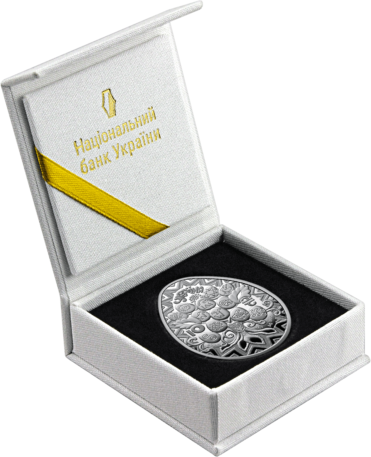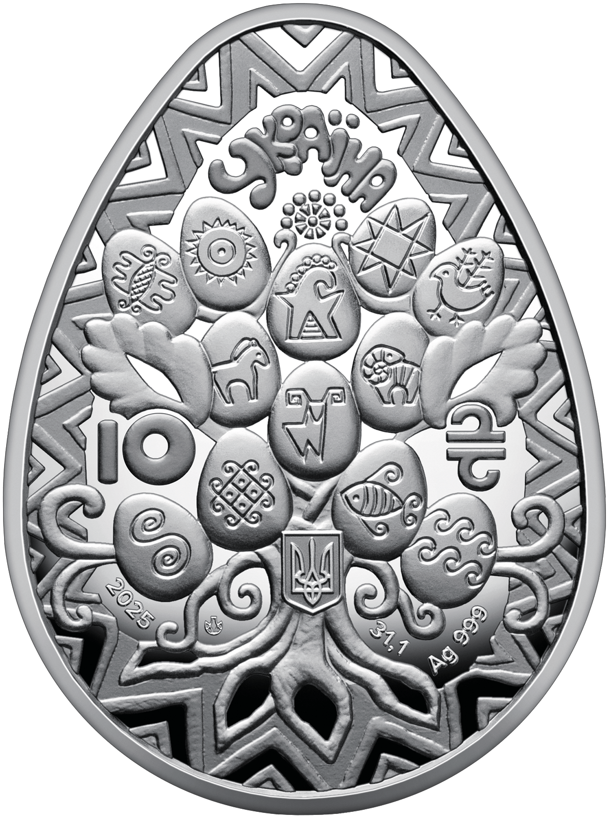У верхній частині монети зазначено напис УКРАЇНА, нижче – номінал 10 (ліворуч) та графічний символ гривні (праворуч), малий Державний Герб України, рік карбування монети 2025, логотип Банкнотно-монетного двору Національного банку України, а також позначення металу та його проби – Ag 999, маси в чистоті – 31,1.