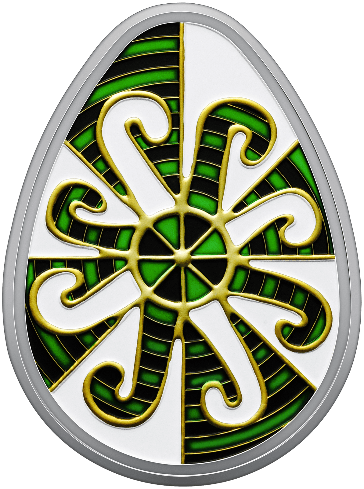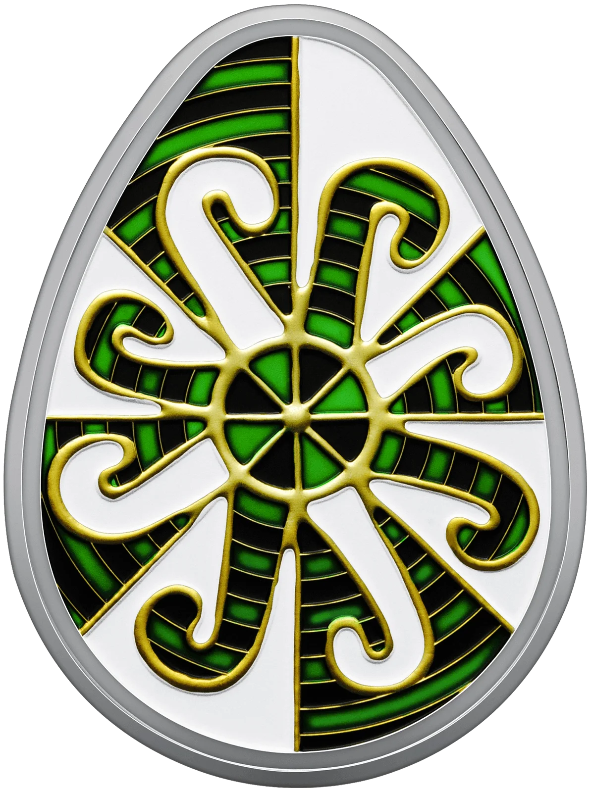 На реверсі монети зображено традиційну писанку Одеської області, відому як “Сорокопуть” або “Козачі левади”. Писанка оздоблена складними орнаментами, кожен з яких має глибокий зміст. Сварга – один із найдавніших символів сонця, щастя, добра, побажання благополуччя та захисту від лиха. Прямий і косий хрести уособлюють тривимірний всесвіт, що об’єднує різні рівні буття. Драбинки символізують духовне зростання, шлях до Бога та прагнення до вищого життя. Сонце на писанці уособлює джерело життя – небесний вогонь, який завжди шанували як символ тепла і світла. Розташовані на білому тлі дві сварги, накладаючись одна на одну під кутом, створюють ефект постійного руху та енергії. Це враження підсилюється серединним колом, яке символізує космос і нескінченність. Поєднання зеленого й чорного кольорів, окреслених жовтим контуром, додає орнаменту особливої напруги та сили, що надихає і заряджає енергією.