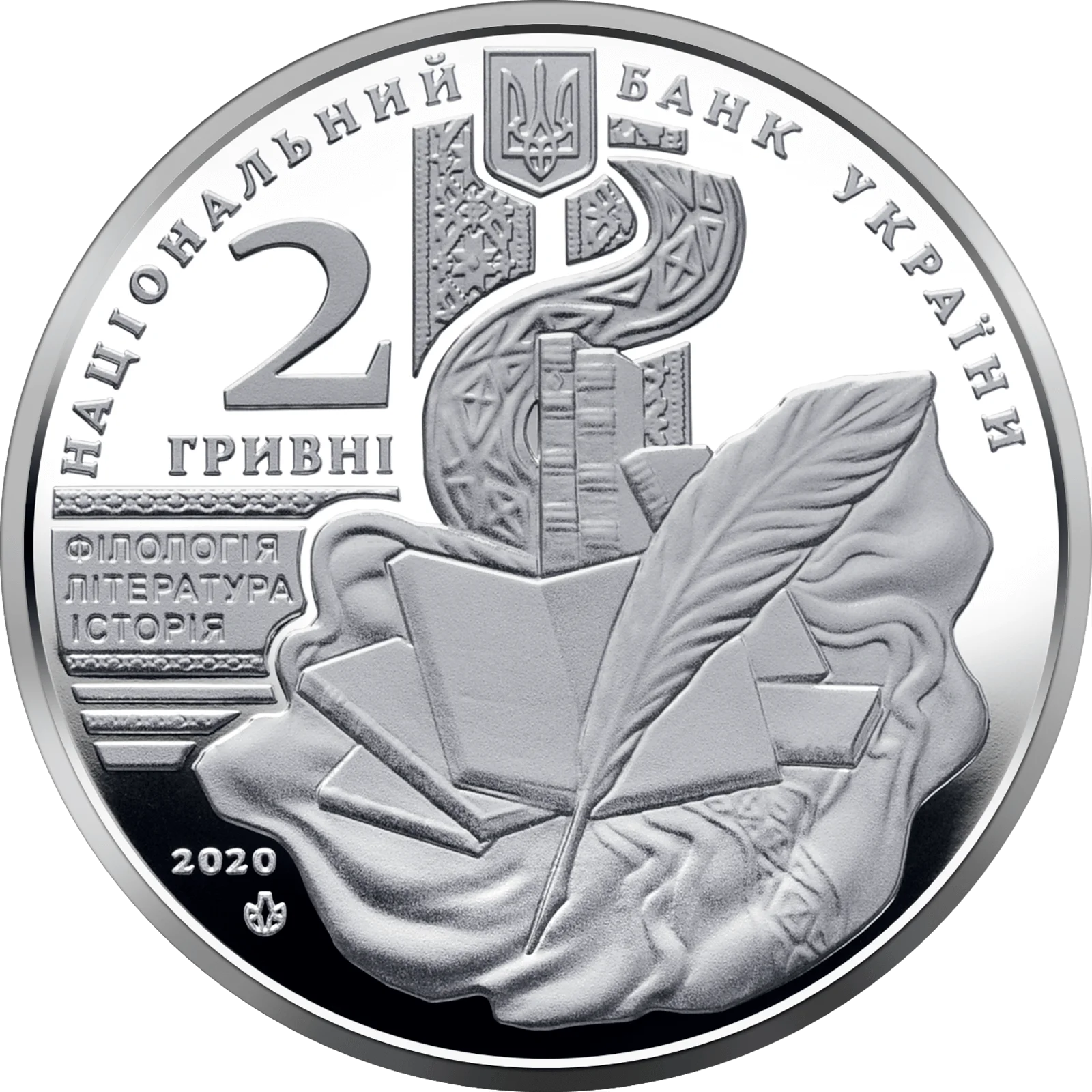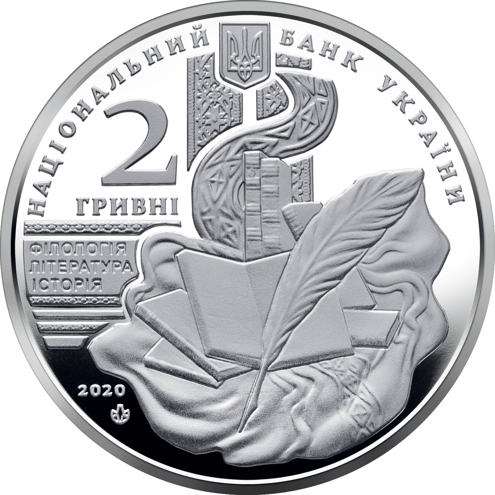 На аверсі монети розміщено: угорі – малий Державний Герб України та напис півколом НАЦІОНАЛЬНИЙ БАНК УКРАЇНИ, ліворуч номінал – 2/ ГРИВНІ, під яким написи: ФІЛОЛОГІЯ/ ЛІТЕРАТУРА/ ІСТОРІЯ (основні сфери діяльності вченого); по центру – стилізована композиція, що символізує професійну діяльність академіка В. Перетца: книги та перо (на тлі розгорнутої книги); рік карбування монети 2020 і логотип Банкнотно-монетного двору Національного банку України (унизу ліворуч).