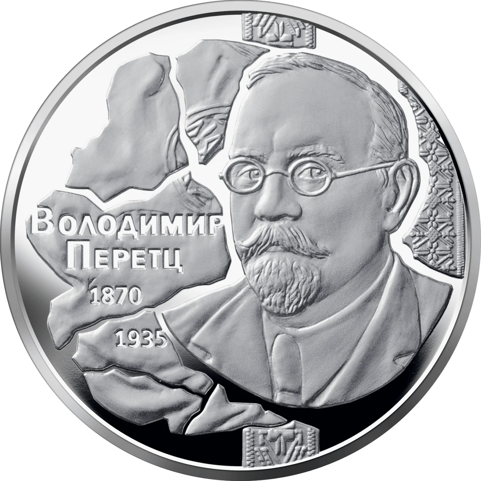 На реверсі монети зображено портрет Володимира Перетца, ліворуч від якого на дзеркальному тлі – розламана рельєфна композиція, що символізує незавершену роботу вченого, який був репресований і помер на засланні; на тлі композиції написи: ВОЛОДИМИР/ ПЕРЕТЦ та зазначено роки його життя 1870/1935.