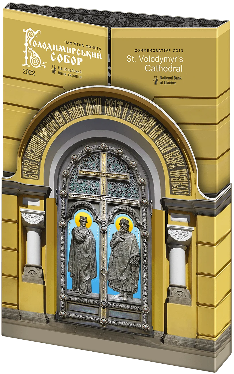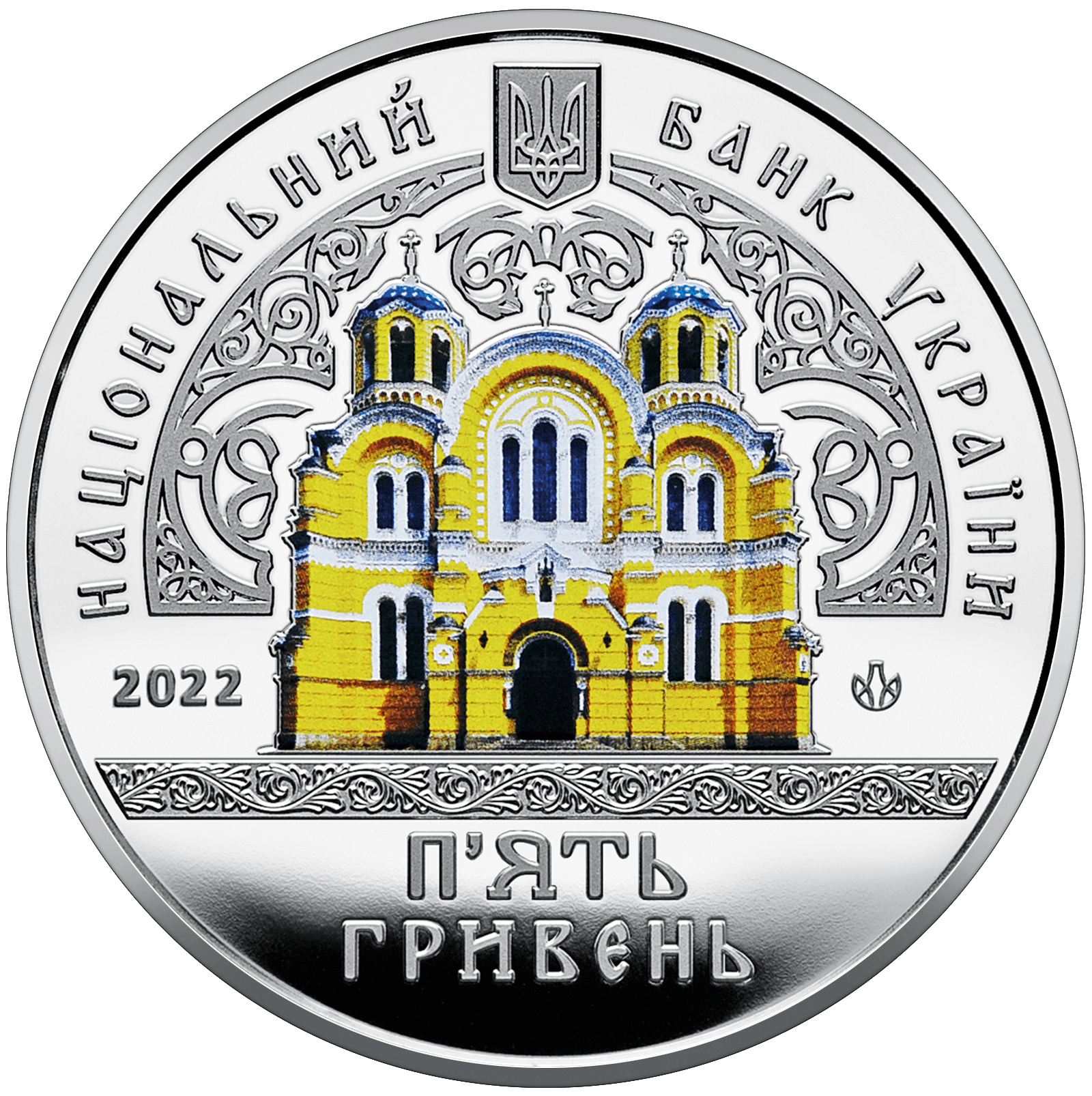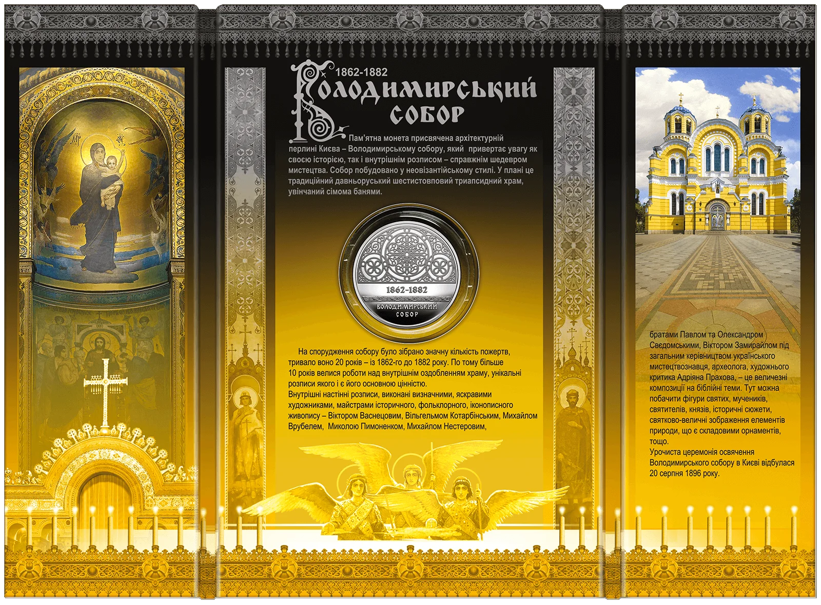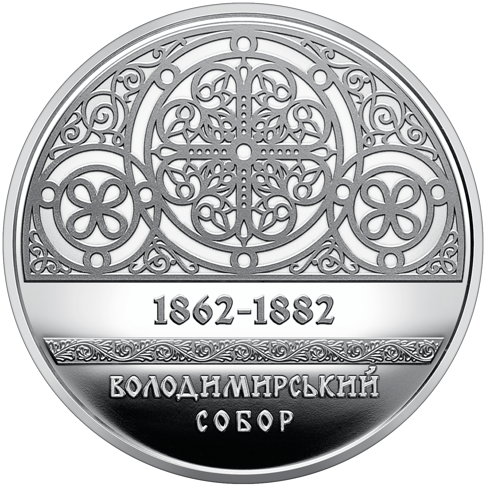 Пам`ятна монета присвячена одній з архітектурних перлин Києва – Володимирському собору. Побудований у неовізантійському стилі він привертає увагу як своєю історією, так і внутрішнім розписом – справжнім шедевром мистецтва. На спорудження собору, яке тривало 20 років – із 1862 до 1882 року, було зібрано значну кількість пожертв. Більше 10 років продовжувалися роботи над внутрішнім оздобленням храму, унікальні розписи якого і є його основною цінністю.